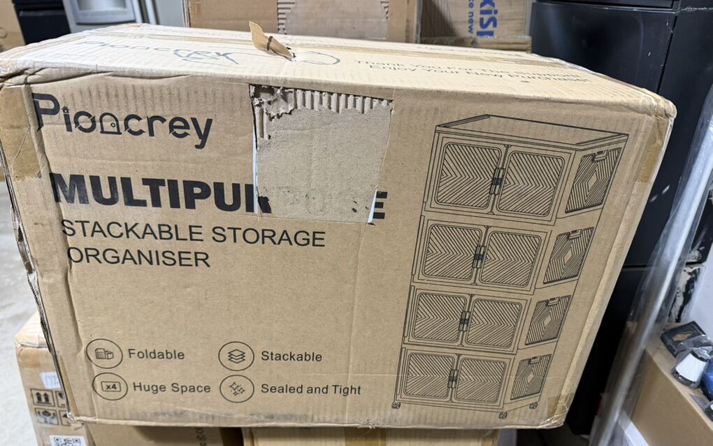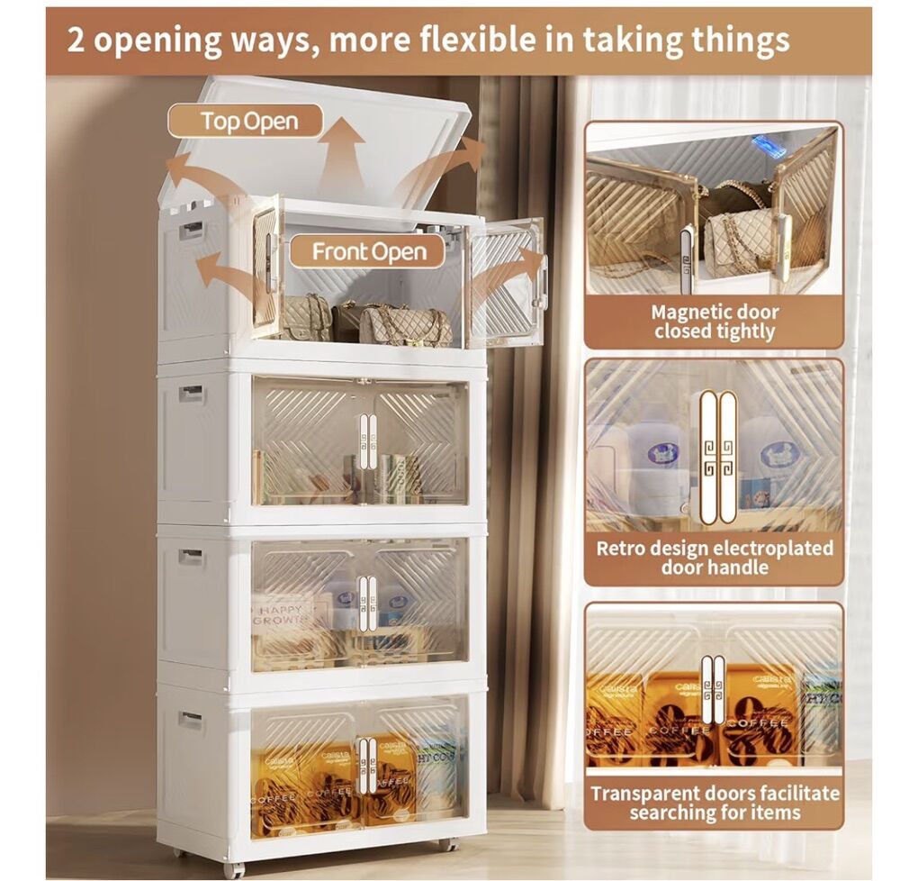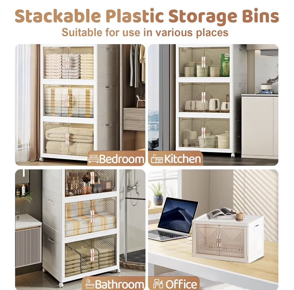 pioncrey Storage Bins with Lid Stackable Storage Containers with Wheels and Magnetic Doors, Plastic Clothes Closet Large Capacity Organizers and Storage Box for Home and Office (4 Pack)