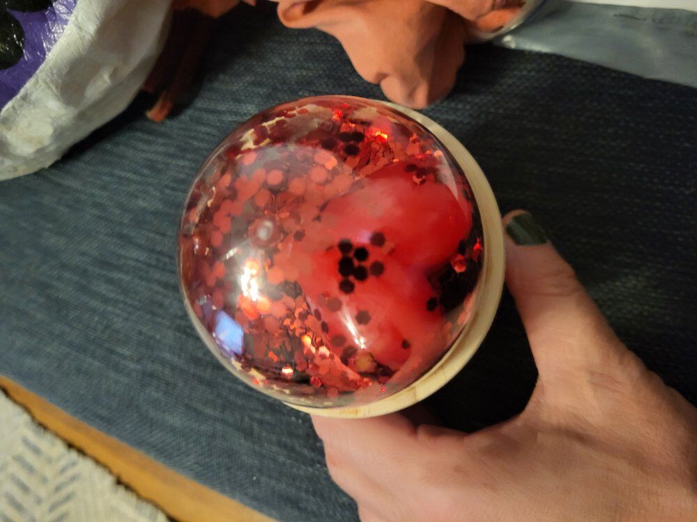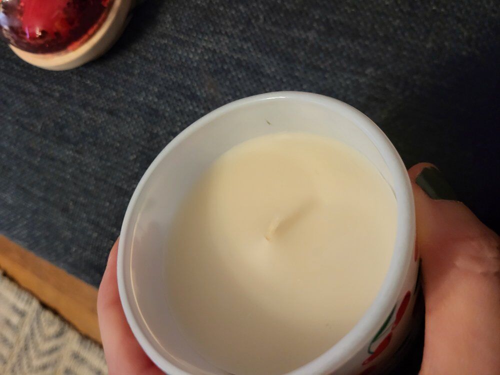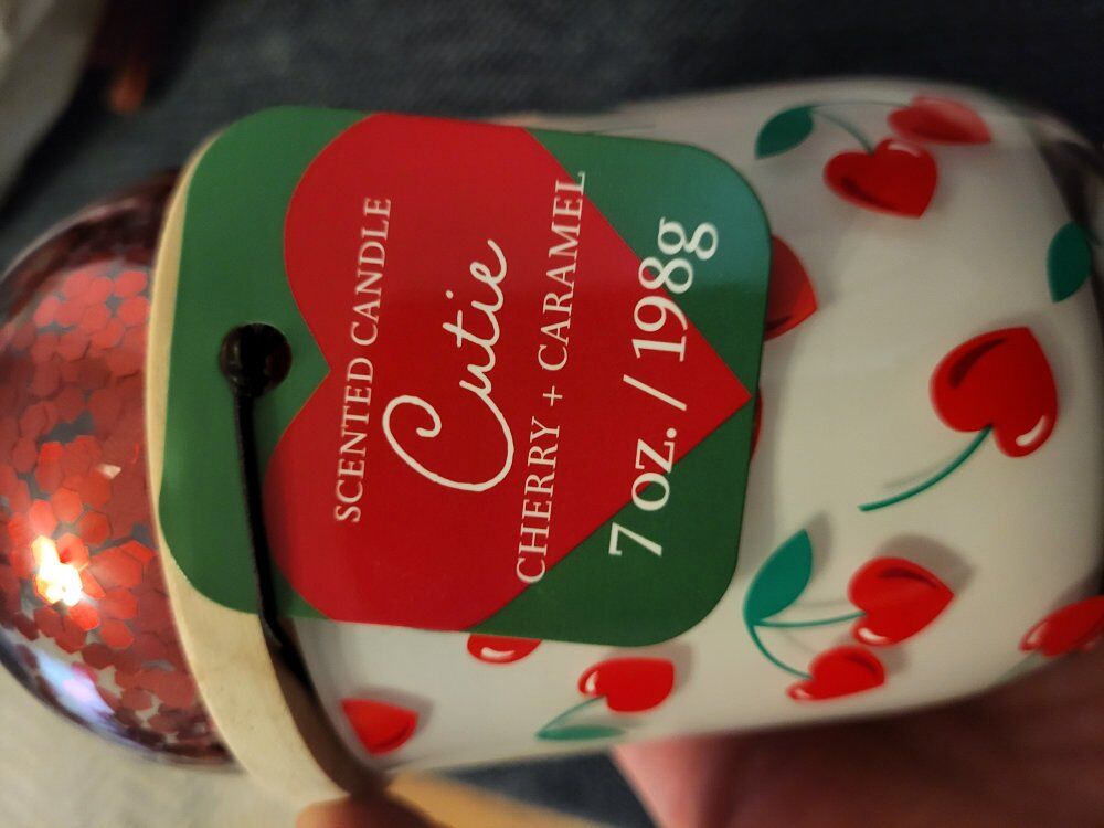 Venmolid with a heart and confetti. glass container candle with heart shaped cherries. Caramel Cherry Flavor, it smells amazing!