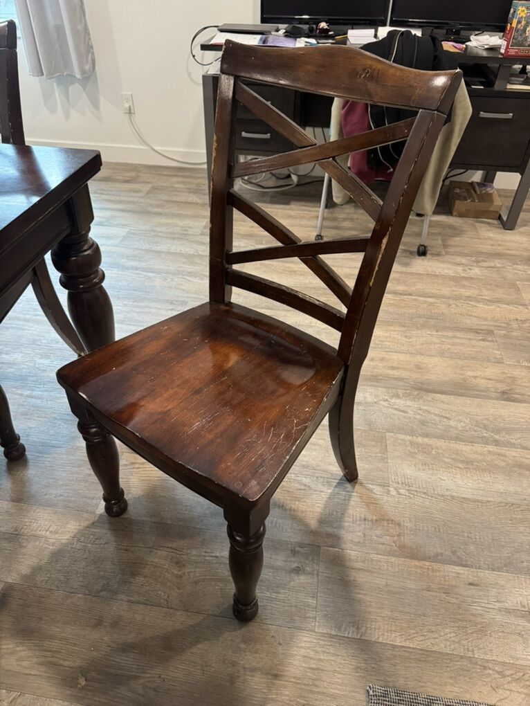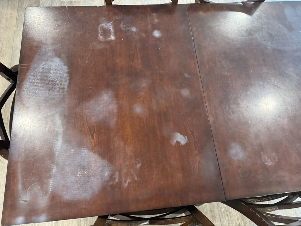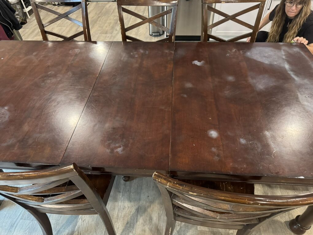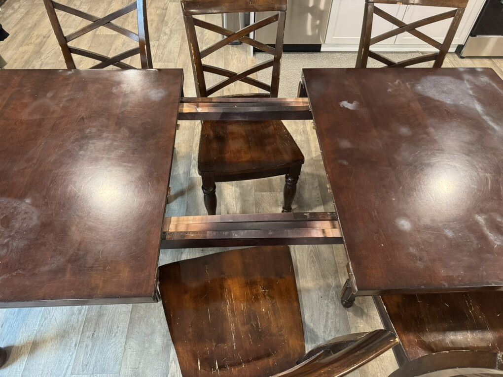 I have a beautiful dark wood table with one extension leaf. It has 7 chairs. One of them has arms, the rest do not. It is 70 inches long and 42 inches wide. The leaf is 18 inches so with the leaf it is 88 inches long. It is 29 1/2 inches tall. Unfortunately the top has several large cloudy white steam spots and the seats of the chairs are scratched. It is a heavy wood set. It’s at about 500 East and 3300 South in South Salt Lake. The top of the table has been taken off of the base to make it easier to move. It heavy though so you’ll need to bring some help to move it. I’m asking just $175. See my other ads for jewelry, artwork, home decor and more.