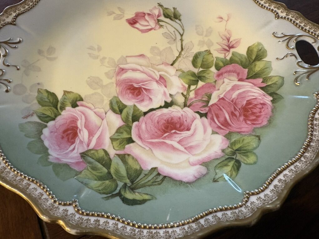 I have a beautiful antique platter with hand painted pink roses and gold trim around the edges. It has 2 small handles. The back is marked O. & E.G. Royal Austria. It is 11 inches long and 10 inches wide. See my other ads for jewelry, artwork, home decor and more.