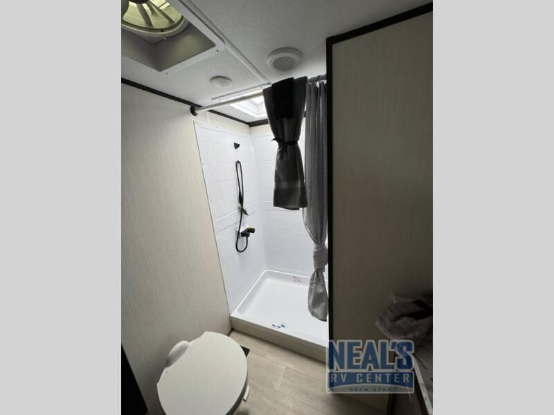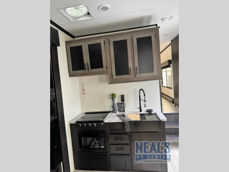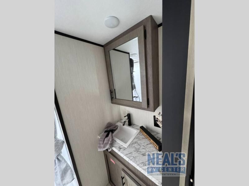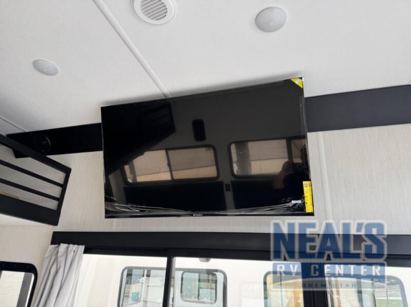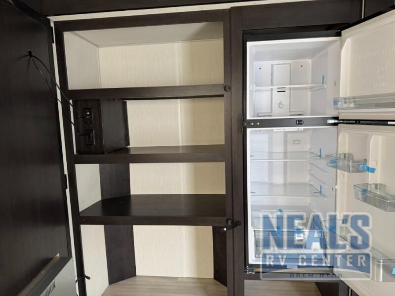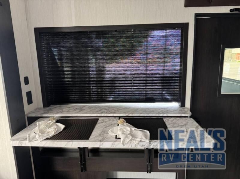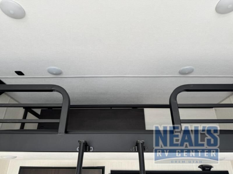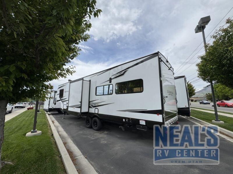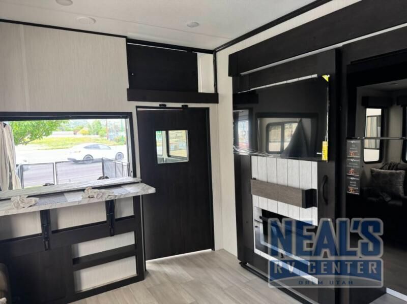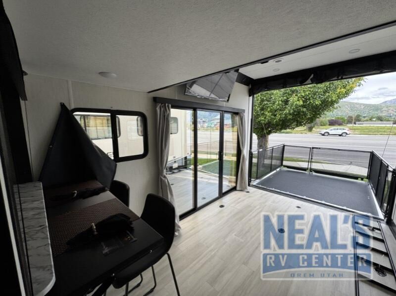 Fun at the campground begins with this toy hauler in tow! There is a 13' separate garage with a loft above for guests plus a patio deck to entertain guests. Your crew can get comfy on the theater seating across from the fireplace, and there is a hidden pantry behind to keep food stocked. The two flip-up countertops with stools provides a fun place to dine since there is a window between, or you can head outdoors to enjoy some fresh air under the two power awnings. A full bath lets you freshen up after a trail ride, and the front private bedroom gives you your own space at night. This unit also features washer and dryer prep in the bedroom so you can add those appliances if you wish!