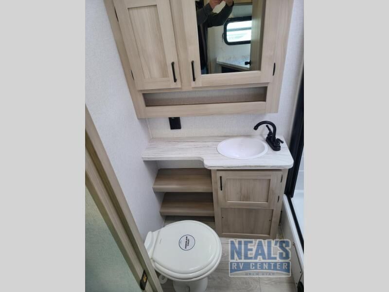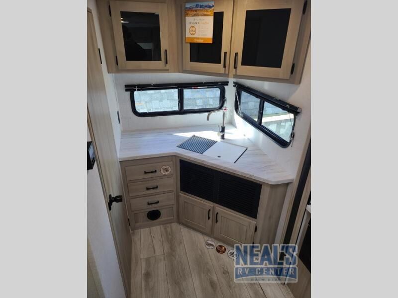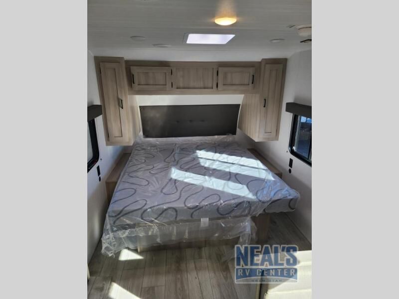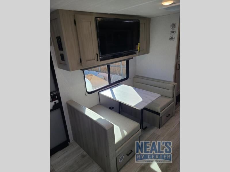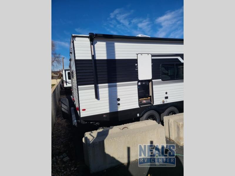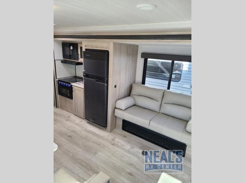 Head to the lake in this travel trailer with a large slide out for more space and comfort! Once you arrive, you can put out the 18' power awning, unload the pass-through storage, and make lunch on the outdoor kitchen with a pull-out griddle and refrigerator. The booth dinette inside can be used as dining space, and there is storage underneath here for added convenience. A jiffy sofa within the slide can be switched out for an optional theater seat if you don't need the extra sleeping space. You will also find a full interior kitchen in the rear corner, and the full bath in the other rear corner is sure to come in handy. When you're ready for some shut-eye, the king bed in the front bedroom will feel just like home. There are also dual wardrobes and nightstands to keep your things tidy!