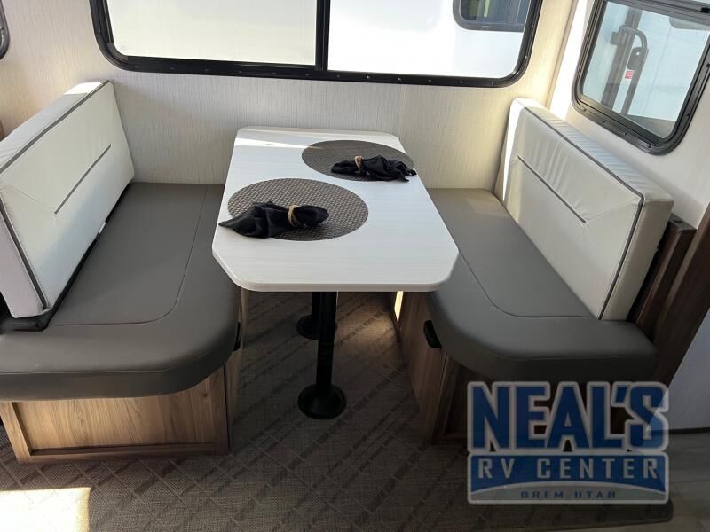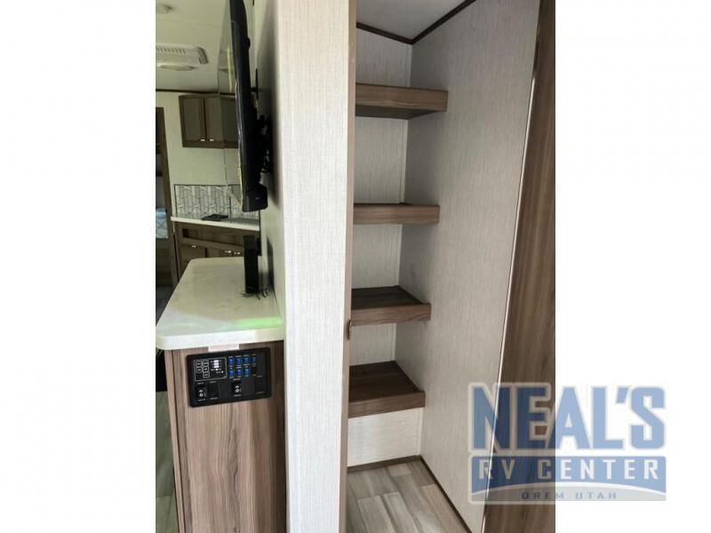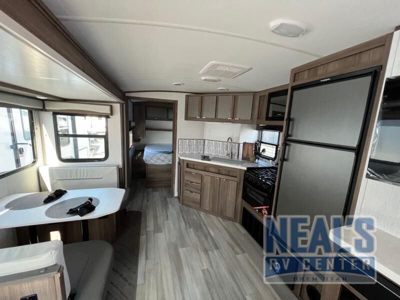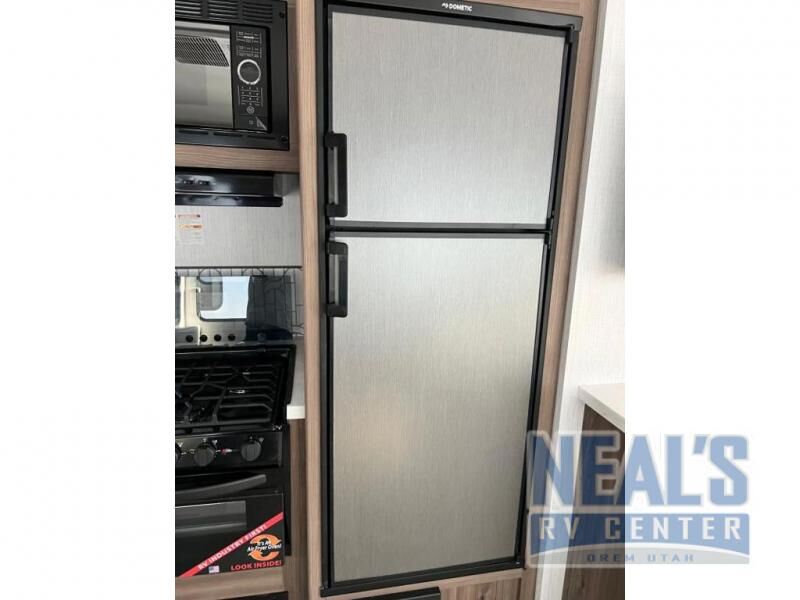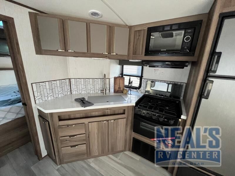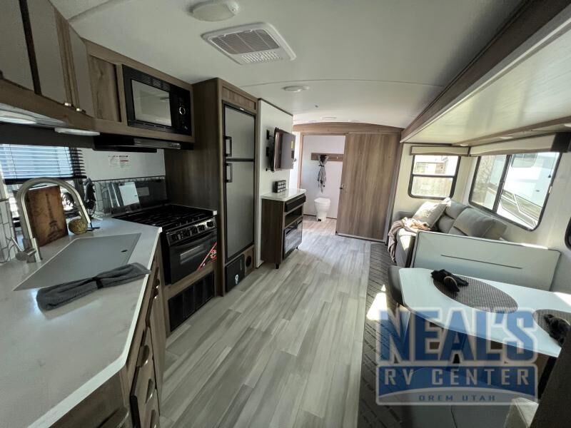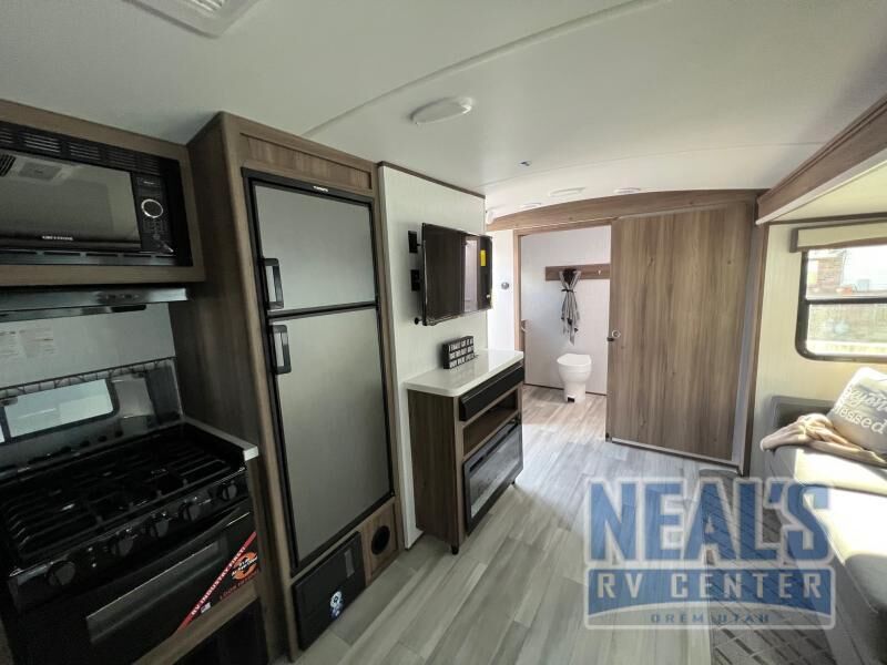 From the full rear bath to the front private bedroom, you'll love every minute spent in this travel trailer. When the large slide is out you can play a game at the booth dinette or relax on the sofa, and the dog will have plenty of space on the floor to stretch out. The full kitchen includes a microwave oven, a 10.7 cu. ft. double door refrigerator, a microwave oven, and a three burner cooktop to cook at-home meals on. You'll find plenty of space to store your belongings, including dual bedroom wardrobes, overhead cabinets, plus an entryway walk-in pantry for jackets, shoes, and food!