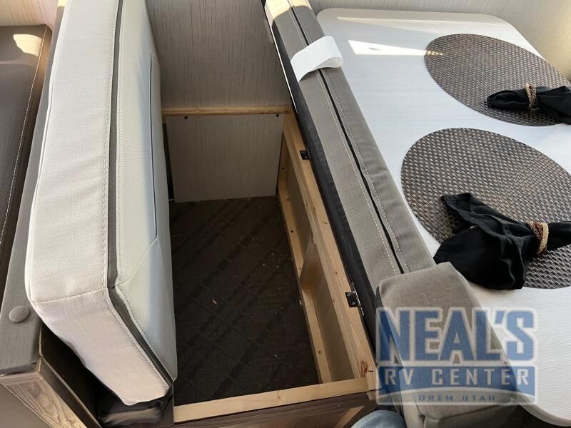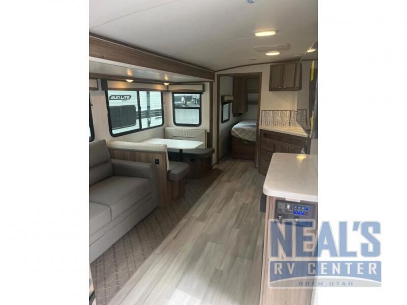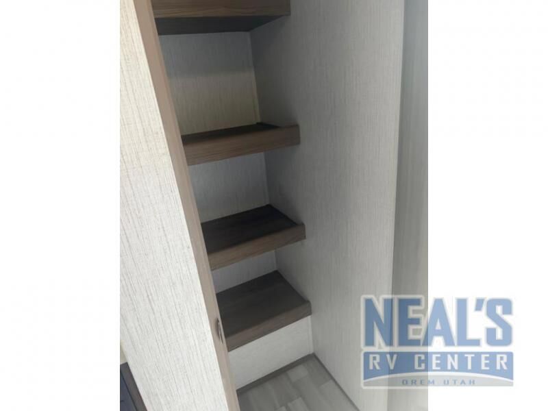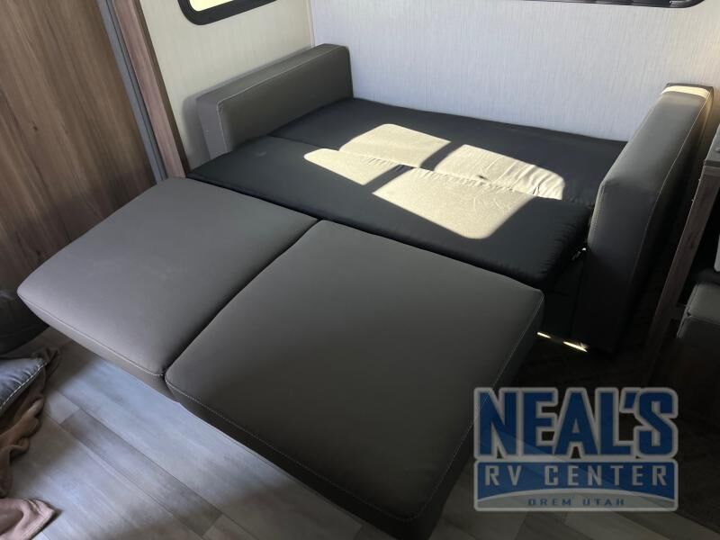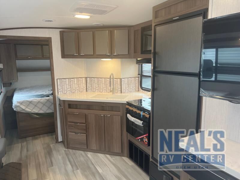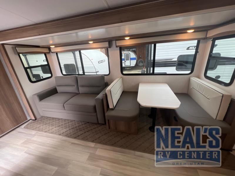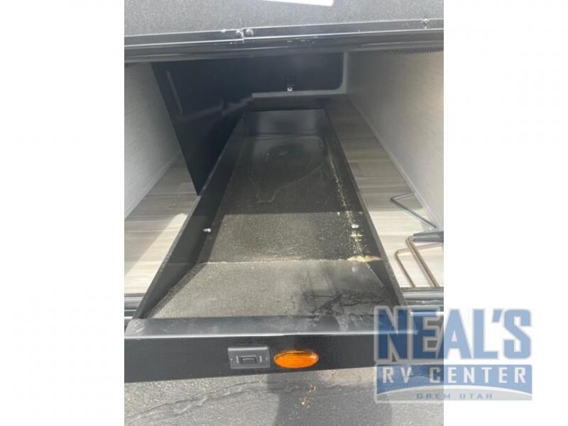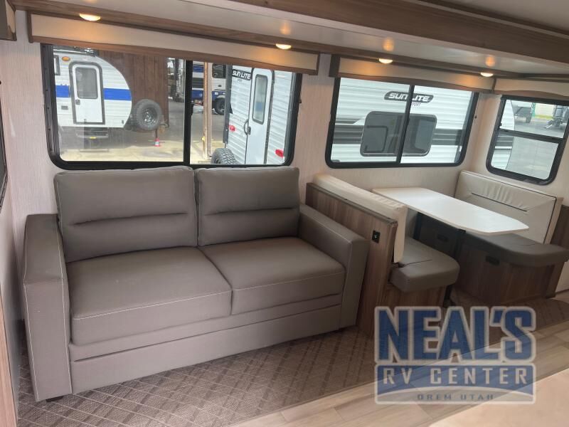 From the full rear bath to the front private bedroom, you'll love every minute spent in this travel trailer. When the large slide is out you can play a game at the booth dinette or relax on the sofa, and the dog will have plenty of space on the floor to stretch out. The full kitchen includes a microwave oven, a 10.7 cu. ft. double door refrigerator, a microwave oven, and a three burner cooktop to cook at-home meals on. You'll find plenty of space to store your belongings, including dual bedroom wardrobes, overhead cabinets, plus an entryway walk-in pantry for jackets, shoes, and food!