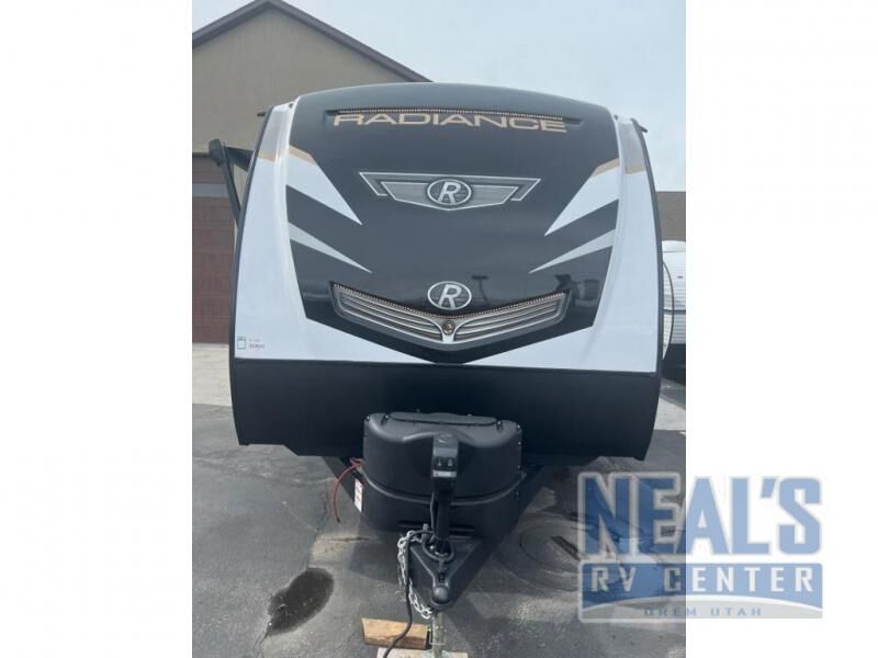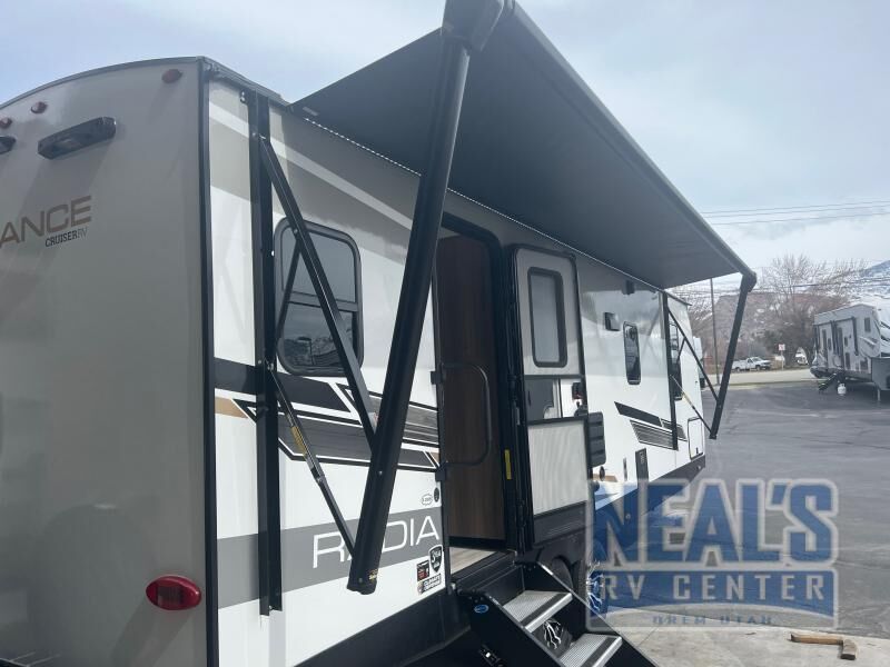 With each Radiance travel trailer by Cruiser you will appreciate the durable construction provided by the Azdel composite laminated walls, the block foam insulation, and the 5-sided aluminum construction. The black-out roller shades in the living area will provide privacy while you're at the campground, and the plywood flooring is made to last through years of camping memories. You will love the seamless countertops, the residential-style free-standing furniture with top-sticking, and the patent pending king bed slide system for added room on each side of the bed. The exterior is sure to turn heads with its high-gloss exterior fiberglass front cap with LED lighting, and the triple entry steps include courtesy lighting for safe footing when loading your gear. When you want to camp in luxury, choose a Radiance travel trailer by Cruiser!