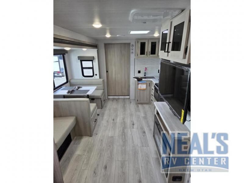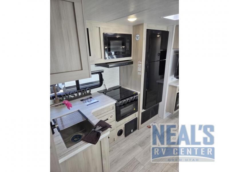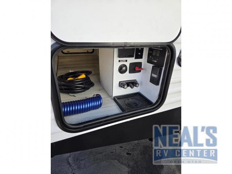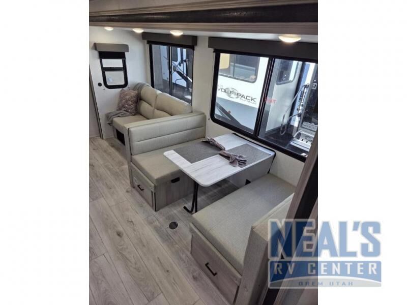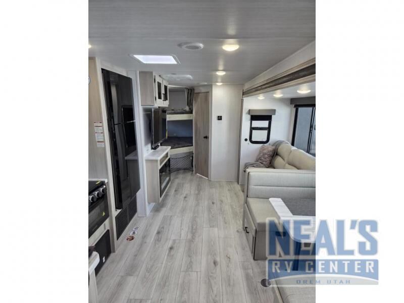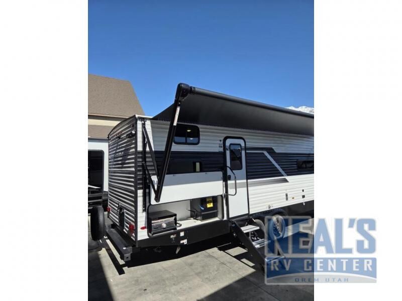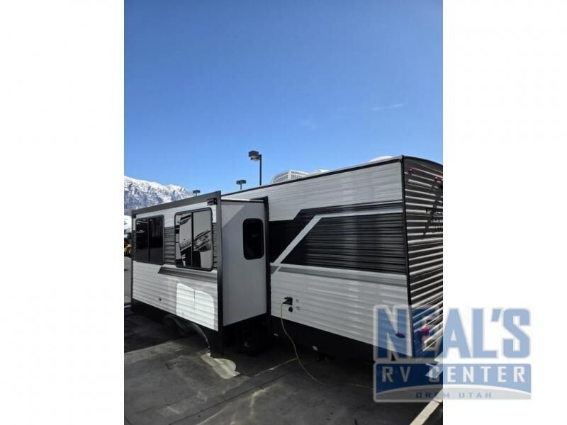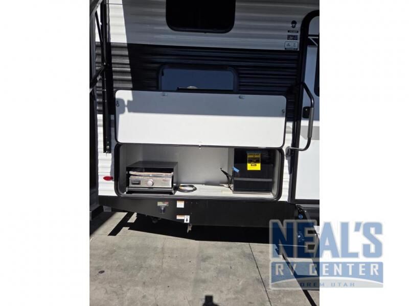 Pack up the whole gang since this unit features sleeping for eight to ten! As you enter you will find easy access to the rear corner bath including a 30" x 36" shower, toilet, and vanity with a sink, plus medicine cabinet just steps away. The slide creates an open and spacious feel for relaxing and dining inside. Here you will find a jiffy sofa and booth dinette with both featuring underneath storage. You will sleep like a king in the front private bedroom with a king bed and a space saving sliding door. Your family and or friends will love sleeping on the double-size bunks and furniture once easily setup for nighttime. This unit also features pass-through storage outside, more exterior storage beneath the double bed bunks, and an outside kitchen with a refrigerator and pull-out griddle.