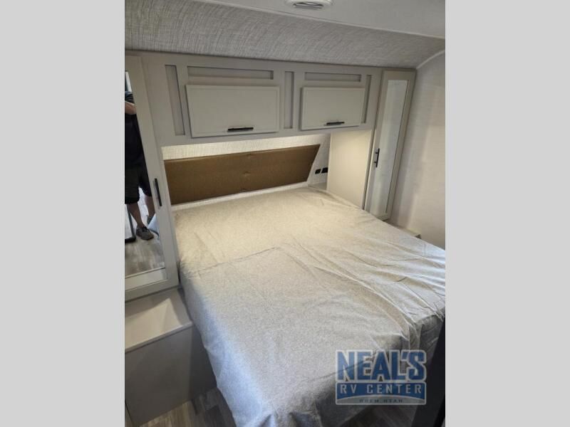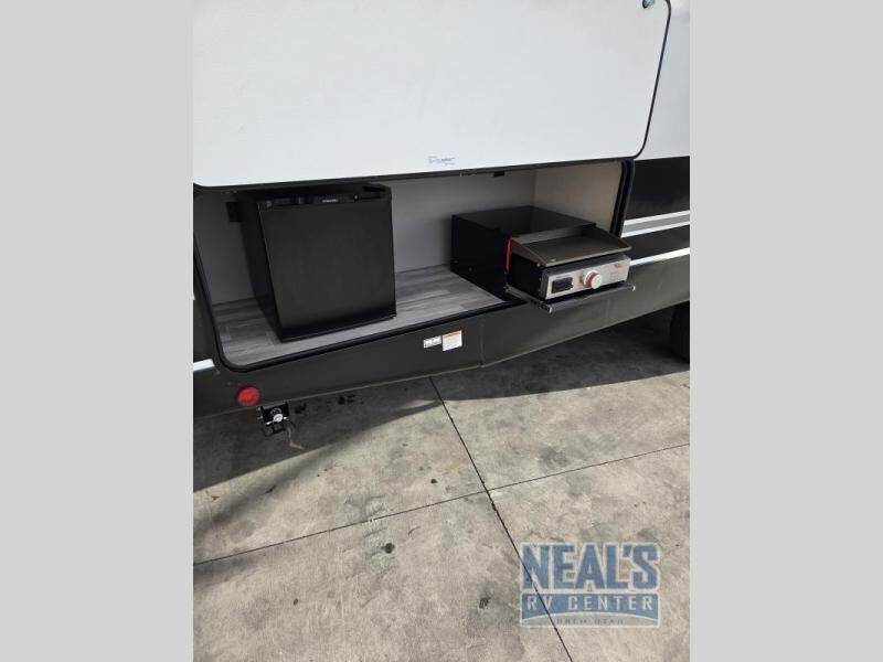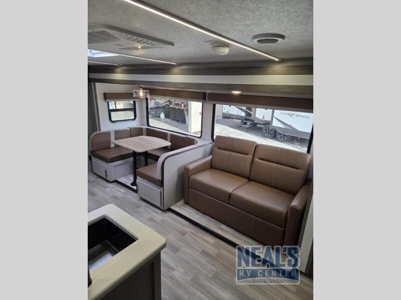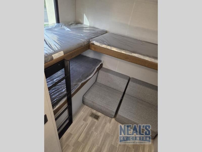 When you want to enjoy the great outdoors, bring your at-home comforts with you in this spacious travel trailer. You can easily sleep ten people thanks to the bunkhouse that includes triple bunks and Vibe cubes. You and your spouse will feel right at home in the front private bedroom on the queen bed, and any other guests can sleep on the U-shaped dinette and sleeper sofa within the large slide out. This model includes all the kitchen appliances needed to cook meals each day, including a three burner cooktop and a black oven, a microwave oven, and plenty of counter space. There is even an exterior grill if you love a sunrise breakfast!