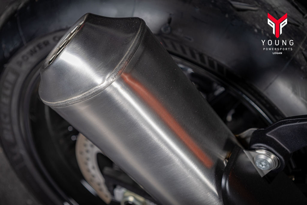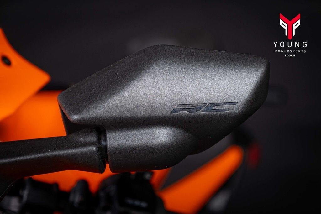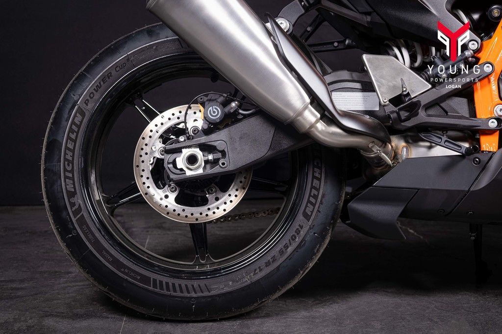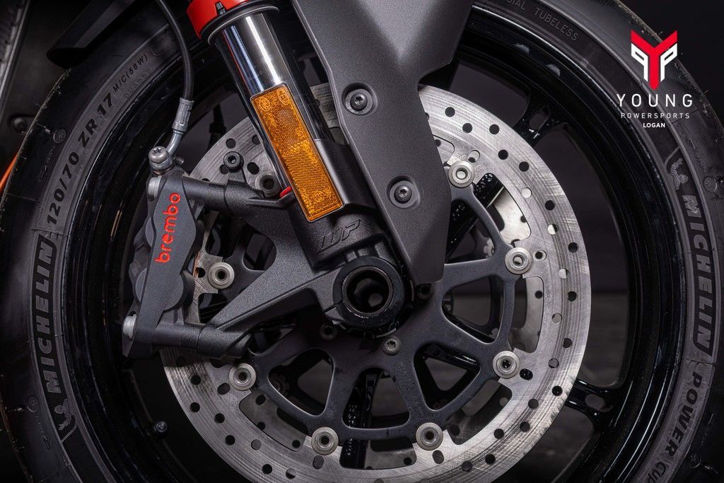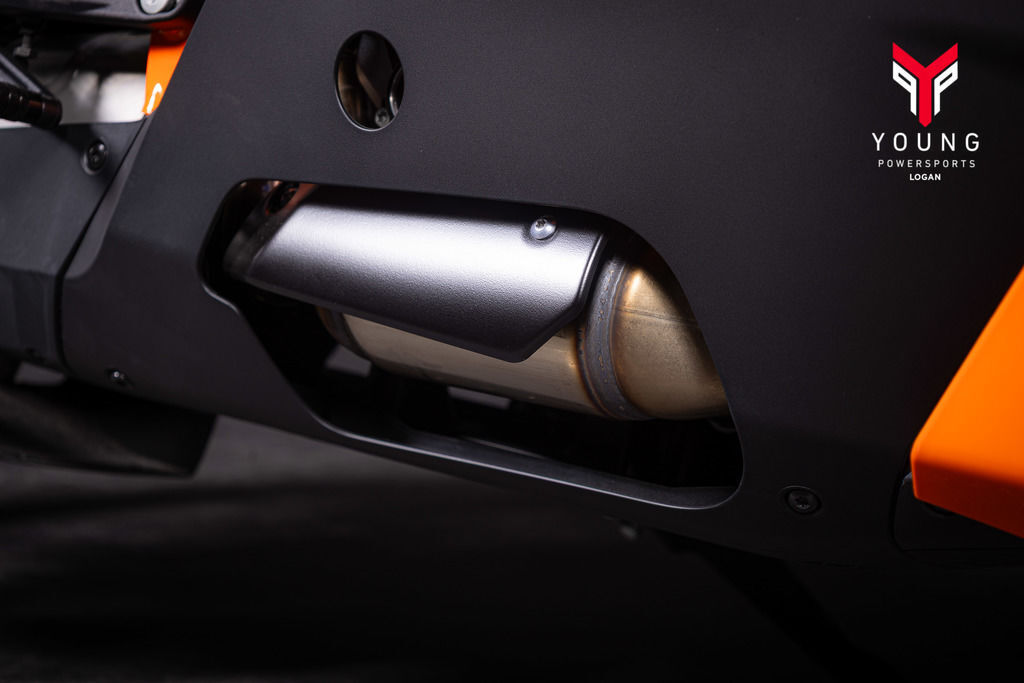 The 947 cc, parallel twin LC8c has been harnessed even further thanks to a tweaked engine map and 100% full throttle opening position to suit the needs of the KTM 990 RC R and the most compact twin in the segment. The impressive engine breathes through a new stainless steel, centralized exhaust muffler, which also helps to urge the whole show to gobble straights and slice corners.