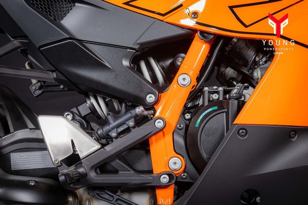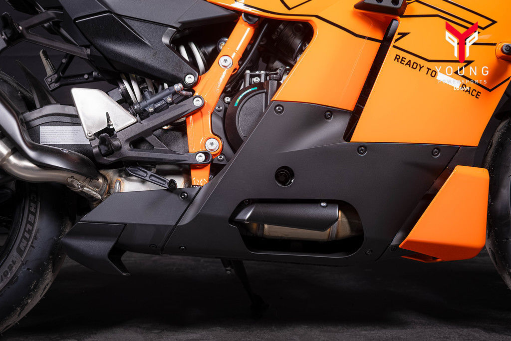 The KTM 990 RC R's ergonomics are standout. To ensure that the rider is integrated in a way to grapple the Supersport DNA of the bike without compromising day-to-day comfort and practicality, KTM has fashioned a tank shape with 6 contact points. The form of the product will suit a wide range of heights and permits the rider to 'glide' around the motorcycle while still being able to exert control through legs, knees and arms. The KTM 990 RC R has aluminum clip-on handlebars, adjustable levers and adjustable footpegs: the standard 'street' setting can be moved 25 mm back and 17 mm higher for a more racing 'track' poise and more influence for full lean angles.
