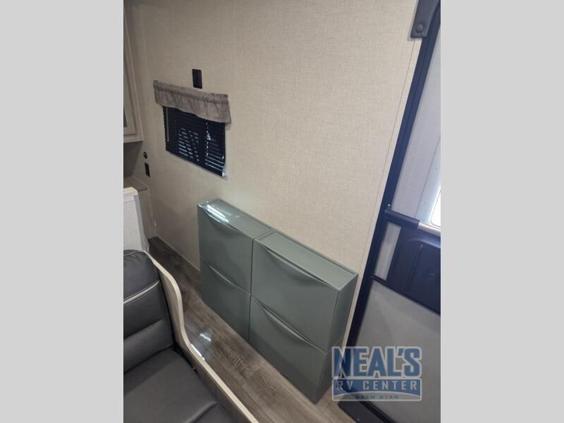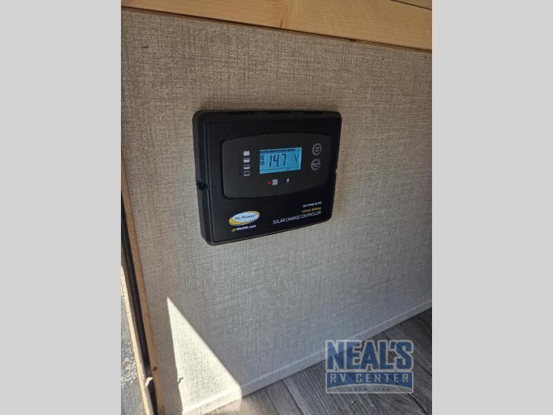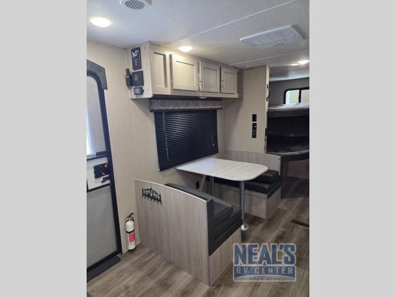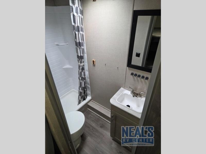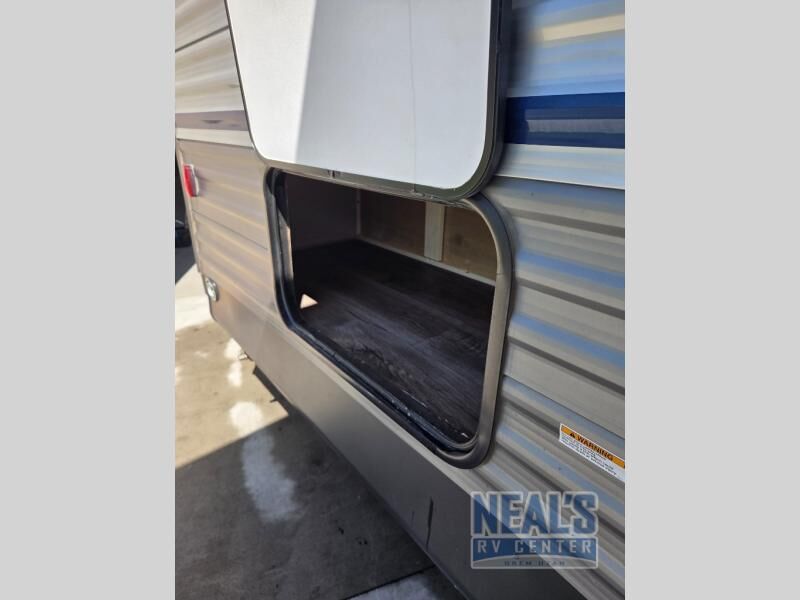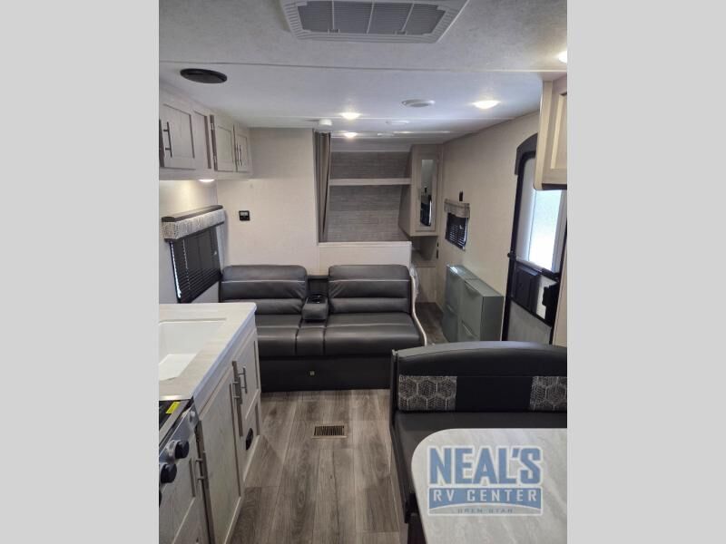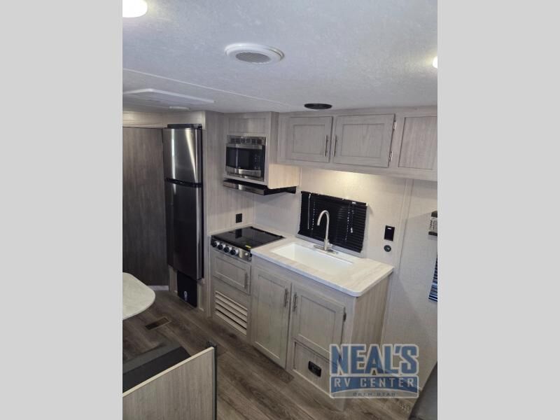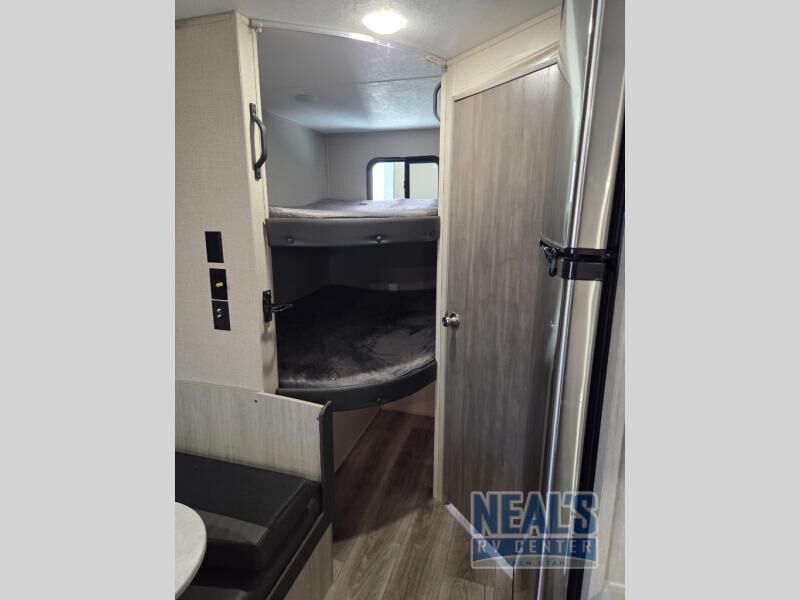 You get to choose to sit at the sofa with flip down cupholders/arm rest or at the dinette when you are relaxing inside. Maybe you want to rest on your own queen bed in the front semi-private bedroom before you make a meal in the kitchen or take a hike through the trails around the lake. The 15' electric awning with multi-color LED lights and a remote offers an outdoor living area where you can visit with other RVers while sitting in your camp chairs that you had stored in the pass-through compartment along the exterior. And the kids will love their own double-size bunks that they can share with a friend or two, and the full bathroom is nearby as an added convenience.