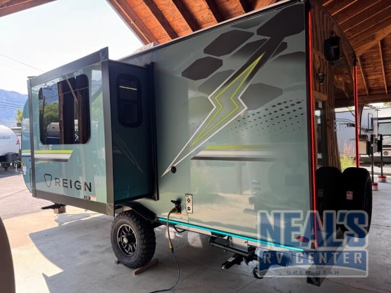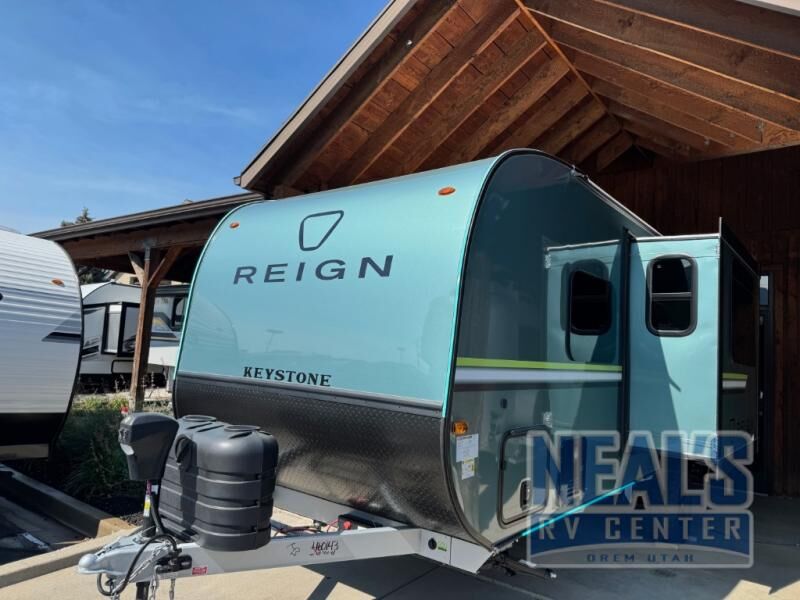 The Reign travel trailers by Keystone are premium single-axle units that are sure to make an impression at the campground. Each one is built with an exclusive automotive-finished aluminum exterior, a walkable roof, and a 100% composite floor for added durability. There are also tinted safety glass windows, quick drop stabilizer jacks, and an exterior shower with hot and cold water. The European inspired interior design is unique and cozy, and the 78" interior height will give you plenty of space to move about. You will also enjoy the ultra bright LED light strip and solid surface countertops in the kitchen, along with blackout night shades, and many more interior comforts.