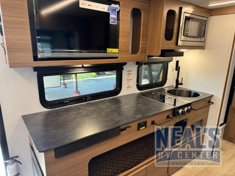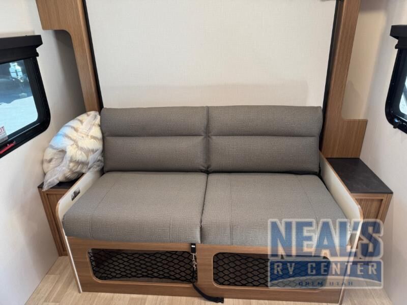 This single axle trailer is both cozy and versatile since there is a fold down sofa/Murphy bed up front! Now you can easily convert seating space into sleeping space, plus there are dual bedside closets to keep your things tidy. A two burner cooktop and air fryer/convection microwave will let you cook meals each day, and there is a huge countertop plus a flip-up extension for even more prep space. This unit also includes a theater dinette where you can relax each day, and the fireplace is sure to make your space feel like home!