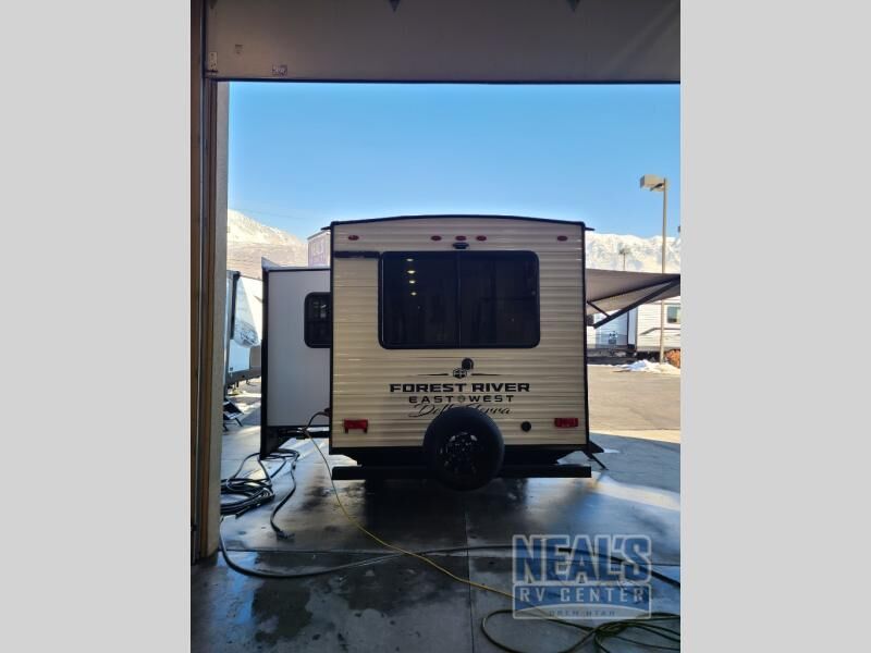 Each Della Terra travel trailer by EAST TO WEST is constructed with an enclosed and heated underbelly and enclosed holding tanks so you can camp all year long. There is also a power tongue jack with an LED light for easy set up and a power awning with LED lights you can rest under after you've unpacked. The Explore Comfort Package comes seamless pressed countertops, kitchen backsplash, window valance package with black night shades, and many more comforts. You will also appreciate the Adventure Outdoor Package with backup camera prep and solar prep, a tankless water heater, an RV grill quick disconnect, and a universal docking station with battery disconnect.
