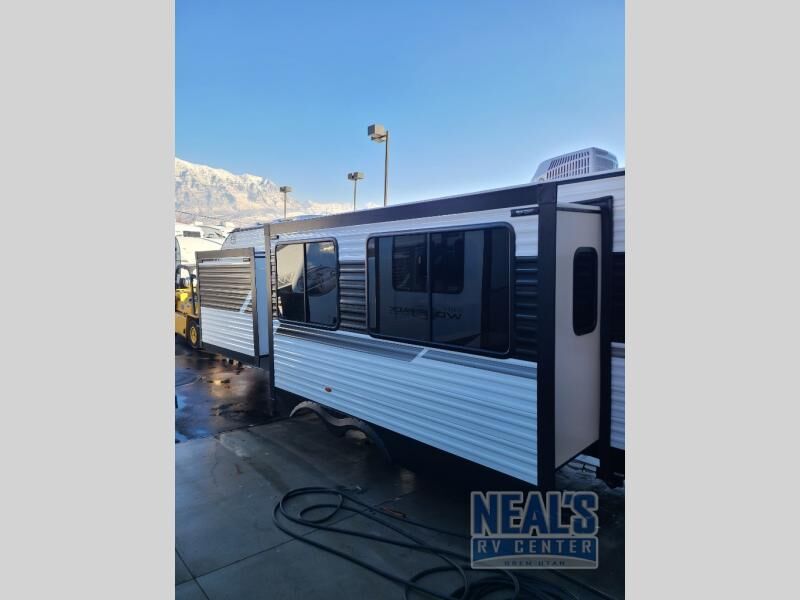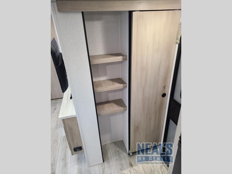 This travel trailer will feel just like home with its spacious interior and at-home comforts. Since there are dual entry doors, you can enter in through the front bedroom or the rear kitchen and living area. A king bed slide in the bedroom is sure to bring comfort, and there is a closet to keep your clothes wrinkle-free, plus washer and dryer prep. The second slide out is found in the living room, and here you can relax on the jiffy sofa or dine at the booth dinette. The chef of your group will love cooking in the rear kitchen, and there is generous counter space here to set out snacks. An entryway pantry and closet will provide additional storage for snacks, jackets, and more!