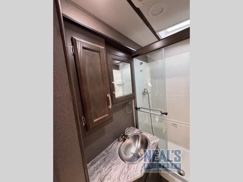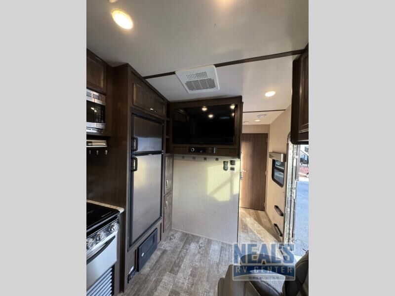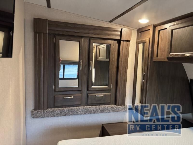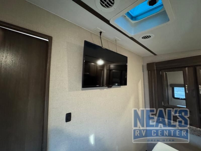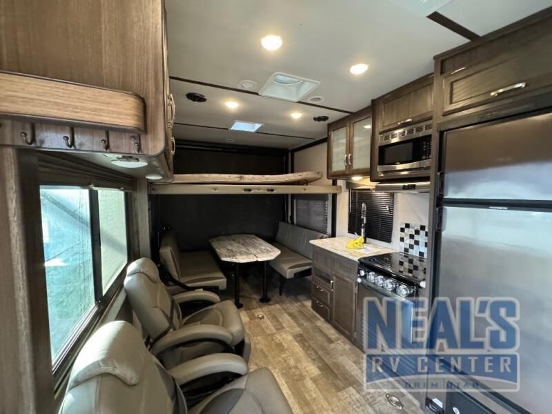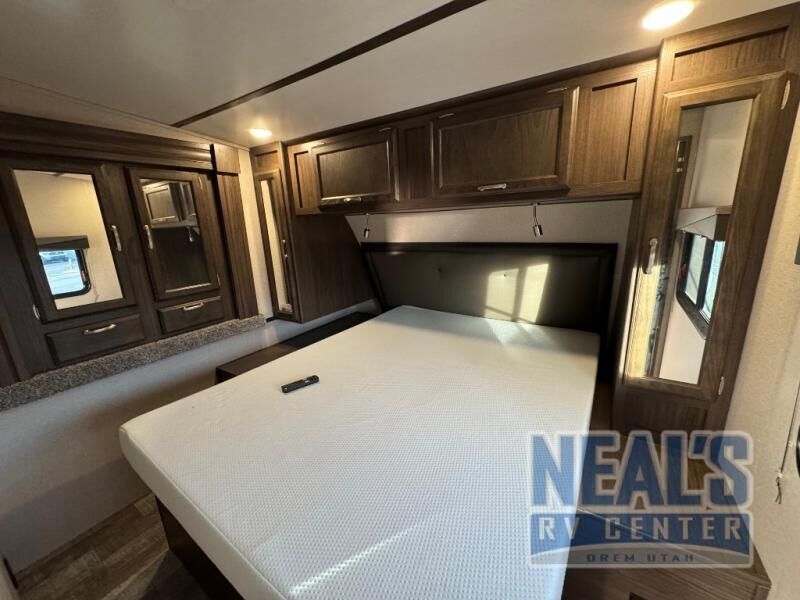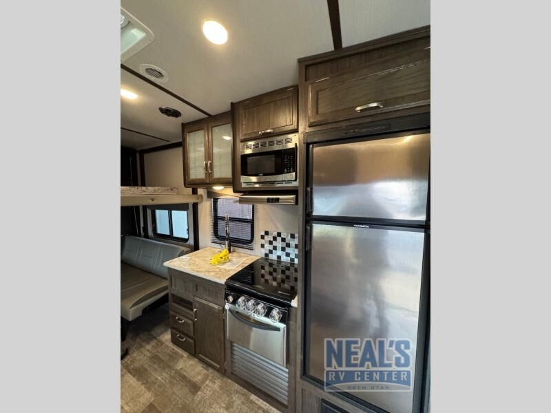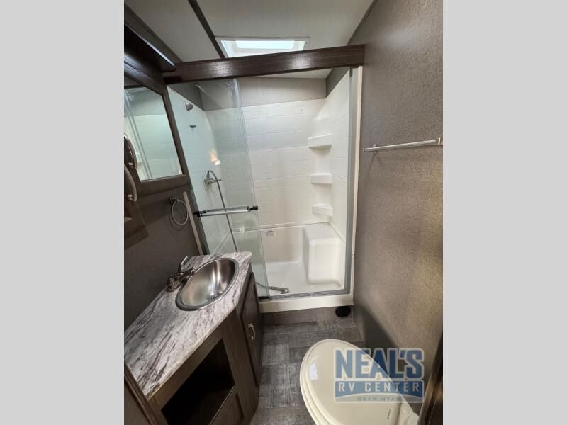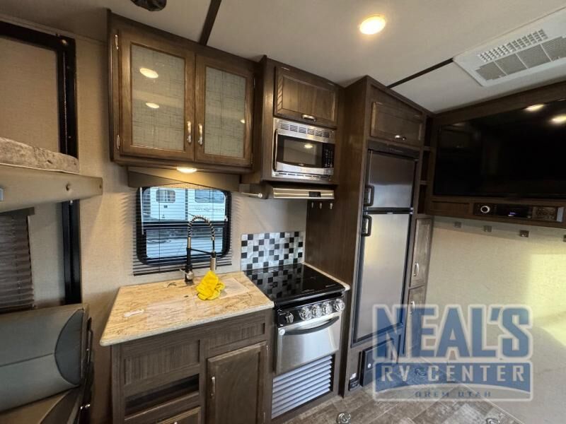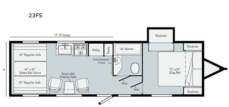 For a fun weekend riding the trails and making some mud, set your sights on this toy hauler! You can easily make it a friends weekend with sleeping space for six in this unit. After you've spent the day outside all day, get cleaned up in the full bath that includes a large 48" shower with a skylight then head to the kitchen to prepare something to eat on the three burner range. You'll also appreciate an 8 cu.ft. refrigerator and a pantry for all your food. This toy hauler also includes a private front bedroom with a slide out wardrobe and a king bed with dual wardrobes on both sides of the bed.