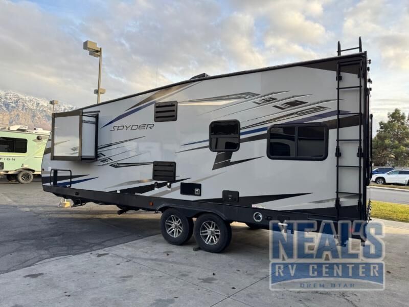 With each Spyder toy hauler by Winnebago Industries Towables you will appreciate the leaf spring suspension, the aluminum frame rear ramp door, and the 30 gallon fuel station to keep your toys ready to go when you are. The cold crack resistant floor provides a durable floor and the 2,500 lb. tie downs will keep your four wheelers secure during transportation. inside, you'll enjoy beautiful solid stained hardwood doors and drawers, a stainless steel kitchen sink, a large shower with a skylight, and an LED TV so you won't miss out on the weather or the news. These models also feature a beaver tail rear end and an exterior shower so you can wash off your riding boots after kicking up some mud!