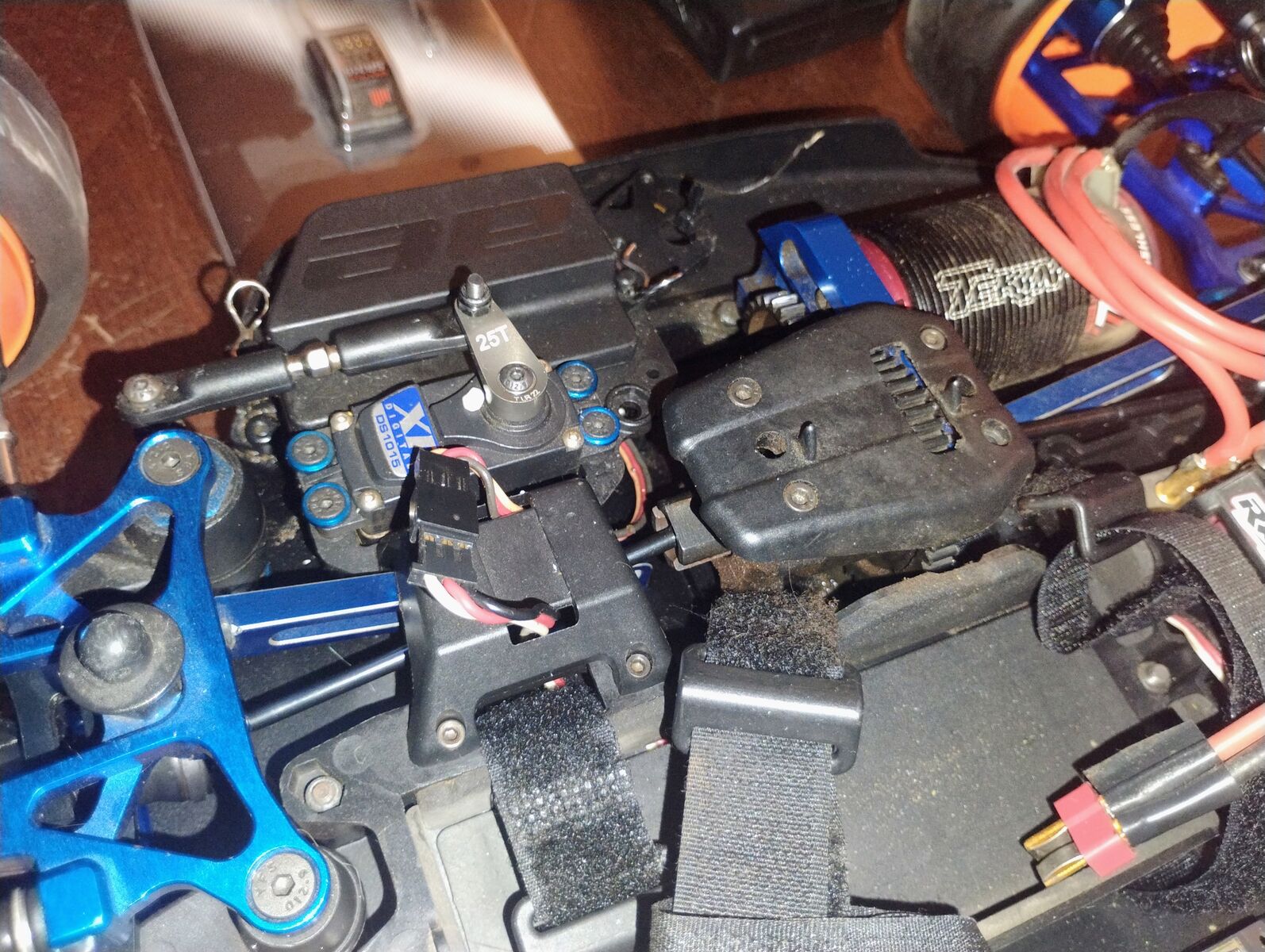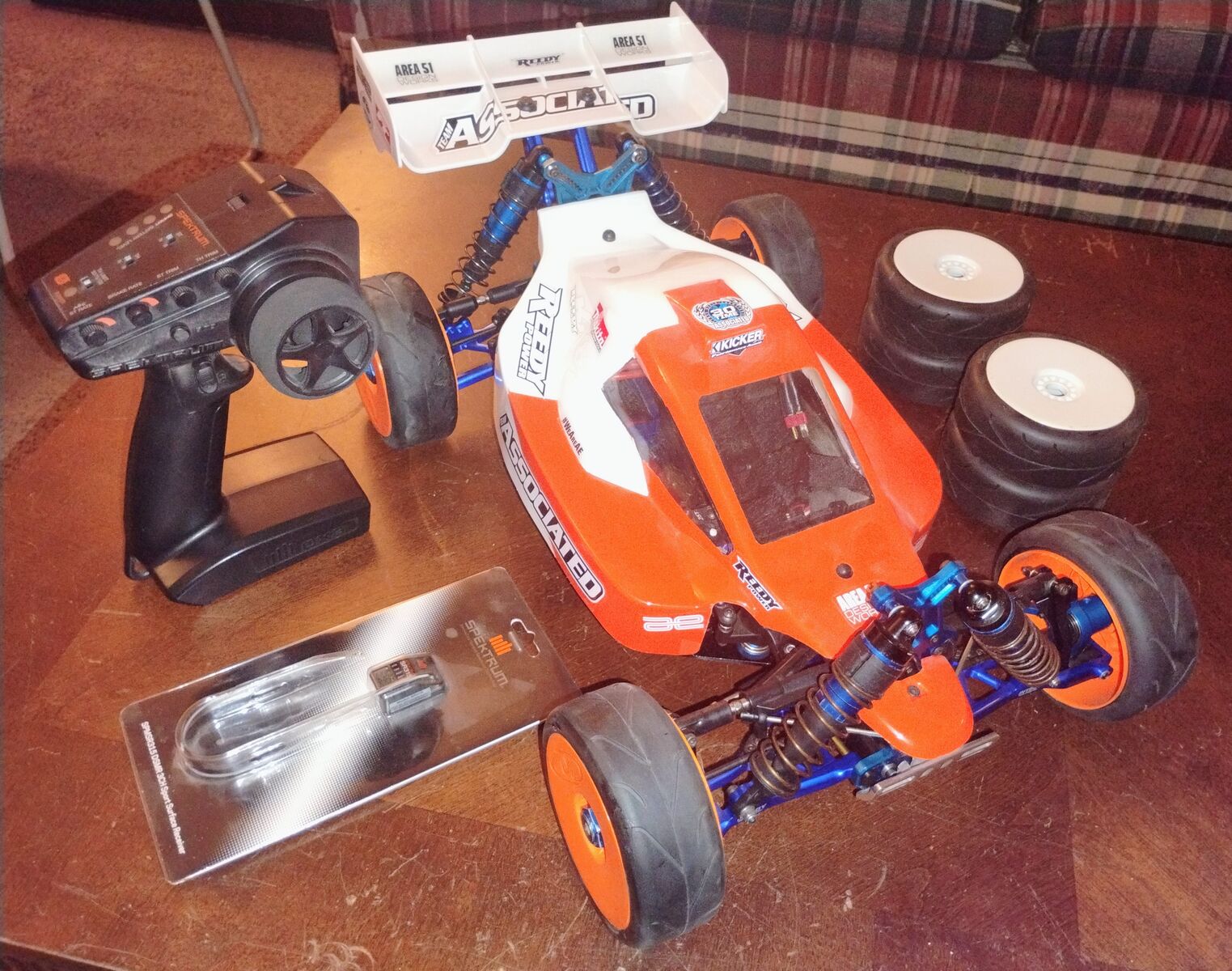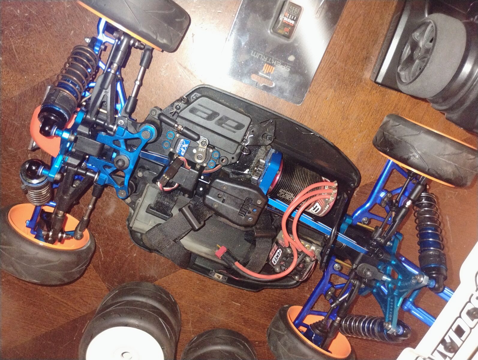 There is some very light (smooth scuffing) on chassis bottom. This was due to being run on carpet (Astro Turf) tracks and was not run on hard asphalt surfaces or rocky surfaces. This buggy has a very nice TEKIN sensored ESC Motor system. The electronics are great with 4s Lipo however, with this body you will want to use the low profile soft pack rather than the hard pack for a better fit to avoid damage to the body. Buggy is RTR when you add your own battery and charger however, the remote has become lost. There is a radio in buggy but, I am including a new Spektrum Radio system. You could bind to the existing radio in buggy or just bind the new system. I am including an extra new set of wheels with tires.