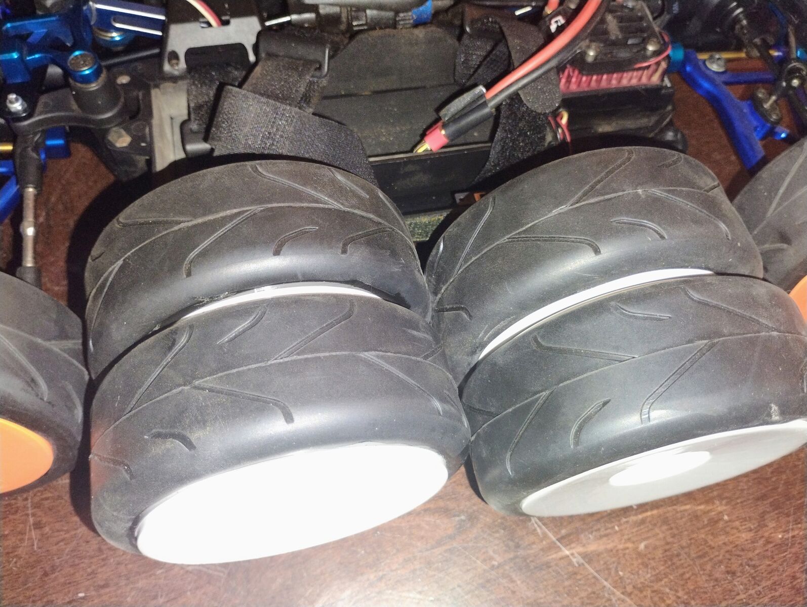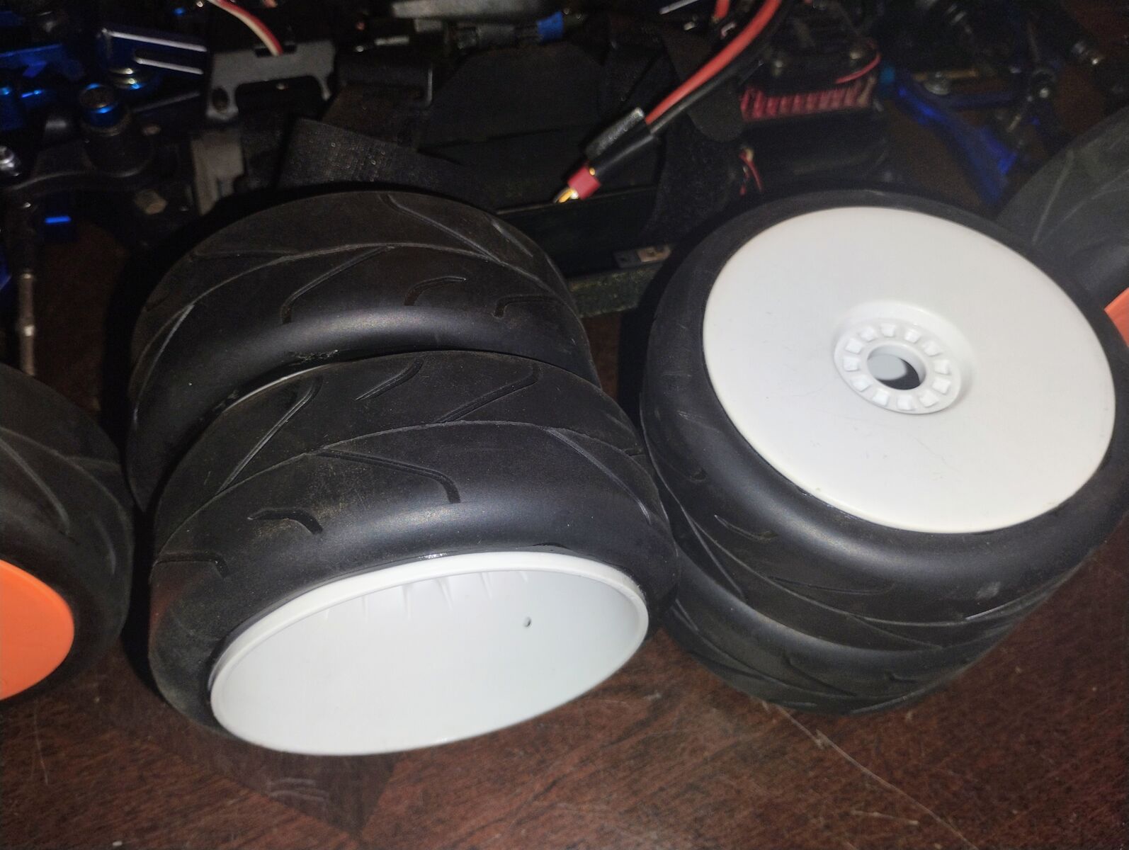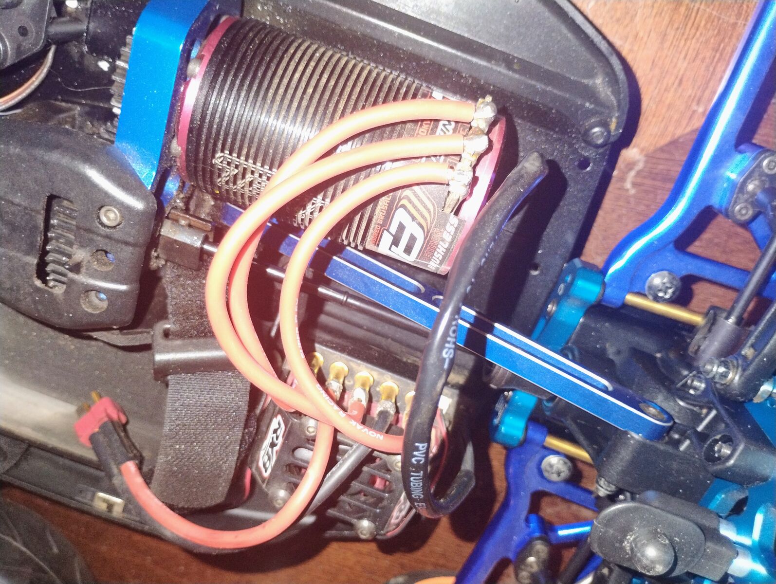 There is some very light (smooth scuffing) on chassis bottom. This was due to being run on carpet (Astro Turf) tracks and was not run on hard asphalt surfaces or rocky surfaces. This buggy has a very nice TEKIN sensored ESC Motor system. The electronics are great with 4s Lipo however, with this body you will want to use the low profile soft pack rather than the hard pack for a better fit to avoid damage to the body. Buggy is RTR when you add your own battery and charger however, the remote has become lost. There is a radio in buggy but, I am including a new Spektrum Radio system. You could bind to the existing radio in buggy or just bind the new system. I am including an extra new set of wheels with tires.