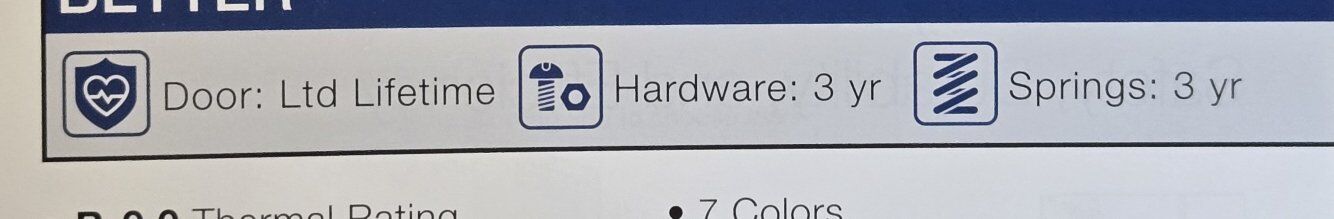 please see the pictures it has all the info for the warranty on the parts and we warranty are installation 100% forever against defects of installation. the garage door itself comes with a 3-year warranty on all parts and lifetime warranty on paint and sections.