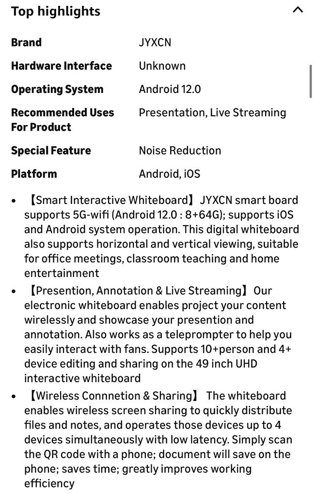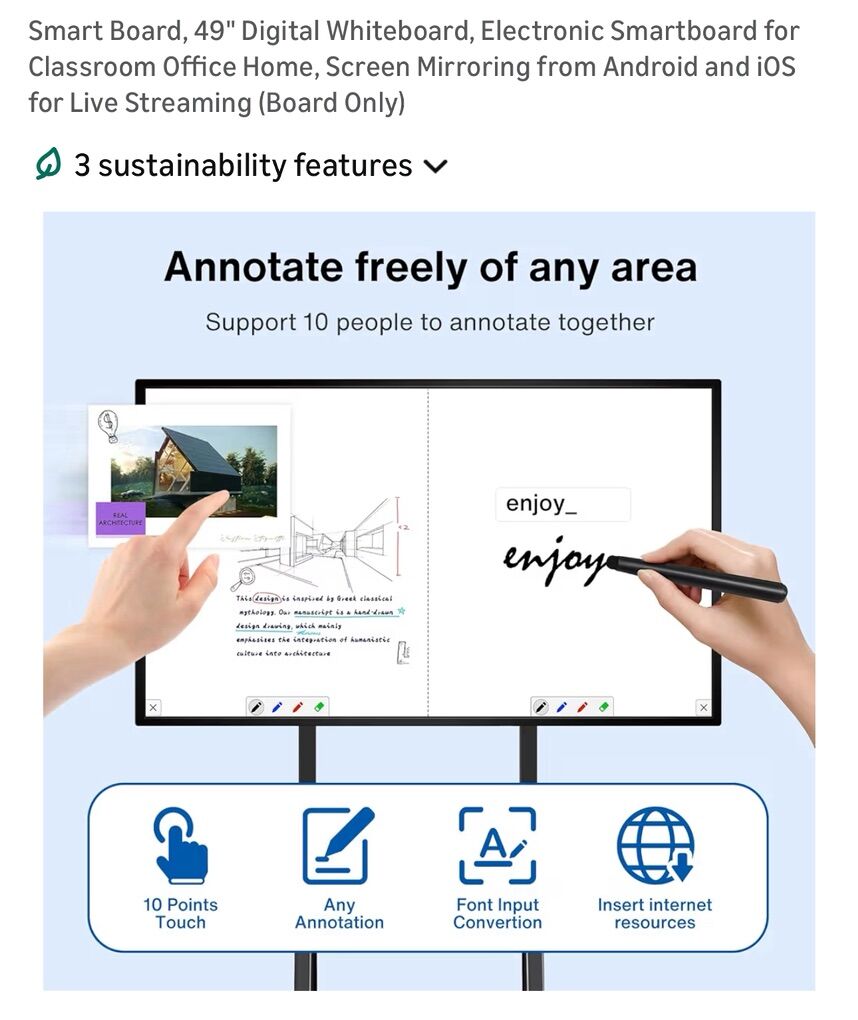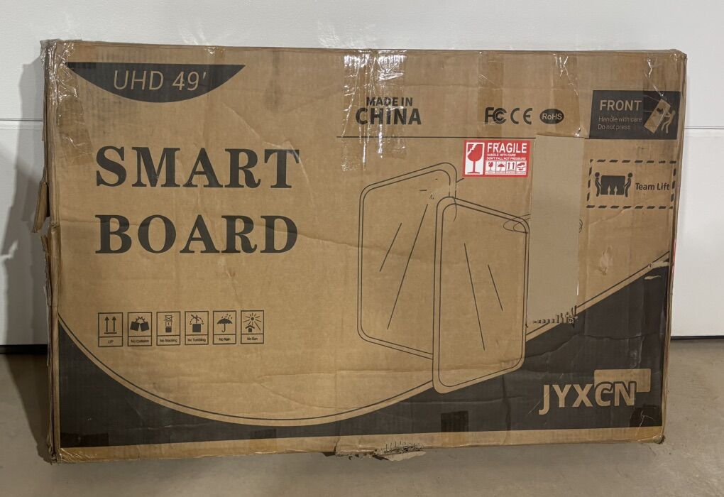 Description- 49” Electronic touchscreen SmartBoard digital whiteboard/screen. Mirroring from Android and IOS devices for live streaming. Wired or wireless split screen sharing of up to four devices. Perfect for any classroom or office! Contains board and wall mount only (optional floor stand shown in some photos is not included). See photos for more product information and specifications.