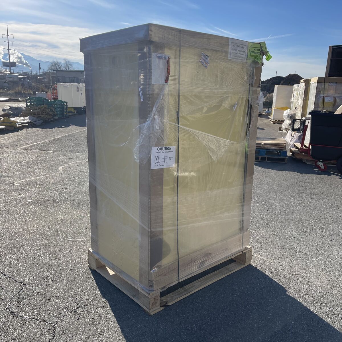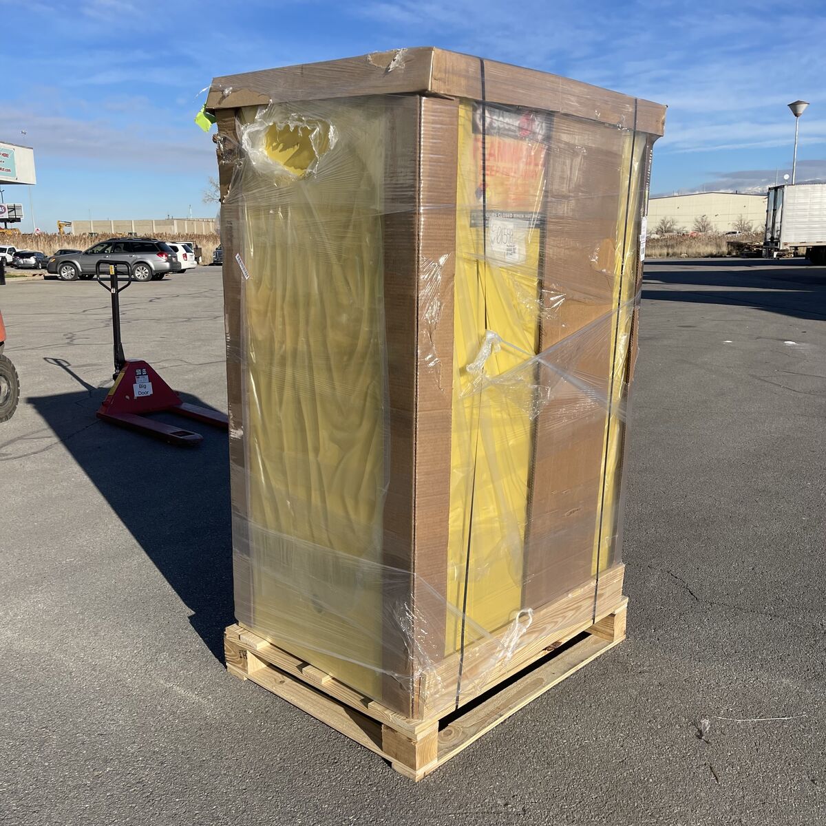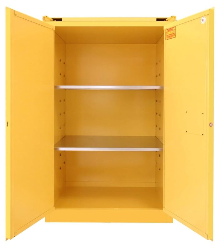 SECURALL Flammable Safety Storage Cabinet Condition: New Size: 90 Gal, 67” x 43” x 31” Color: Yellow MPN/Model: A390