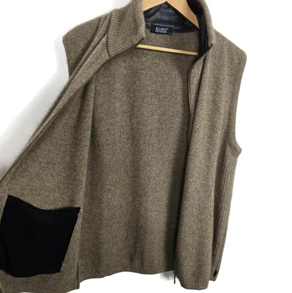 VenmoKoru full-zip vest in merino lambswool with silk and leather trim. Men’s size XL. Mocha brown colorway. Excellent used condition.