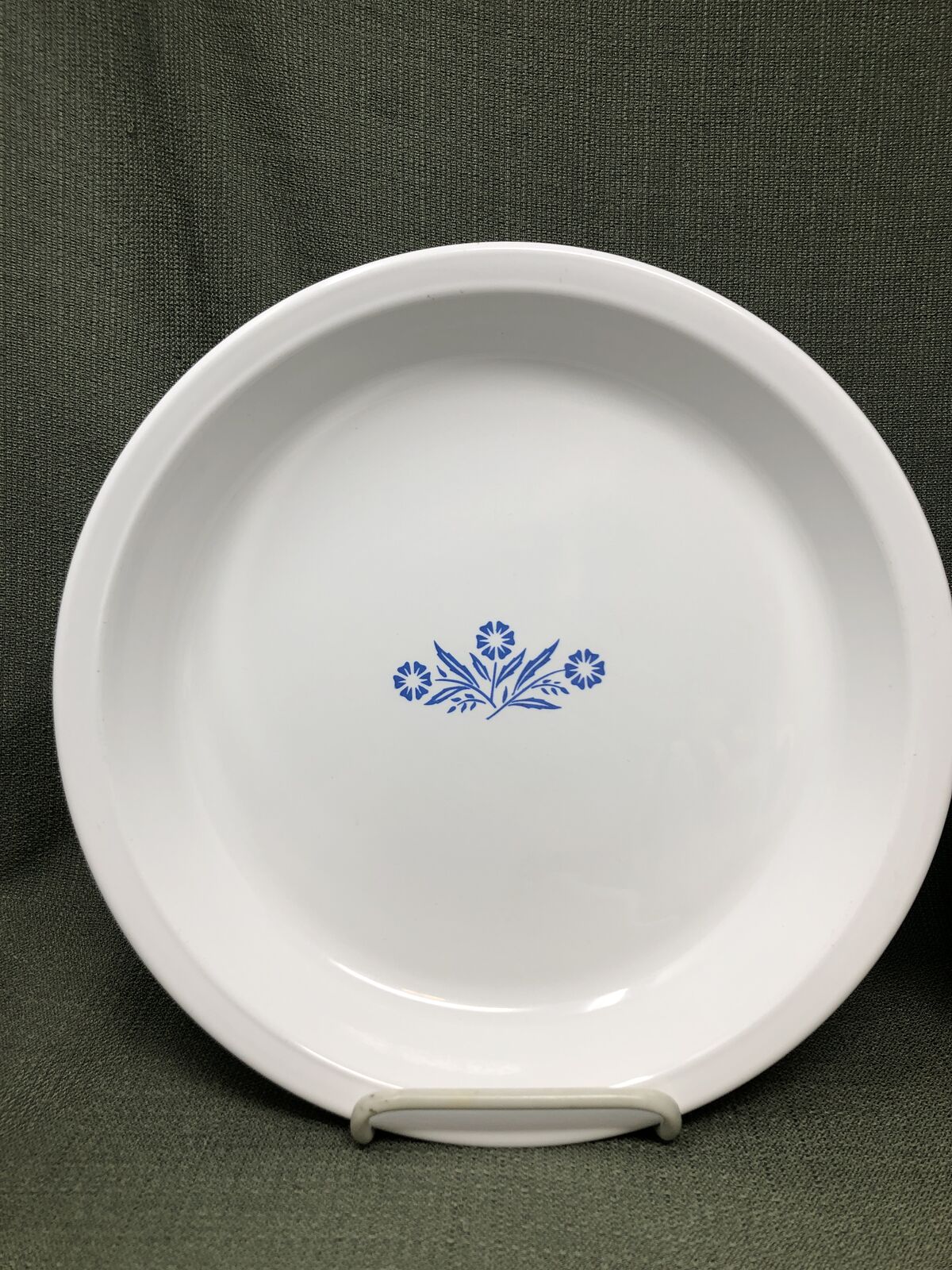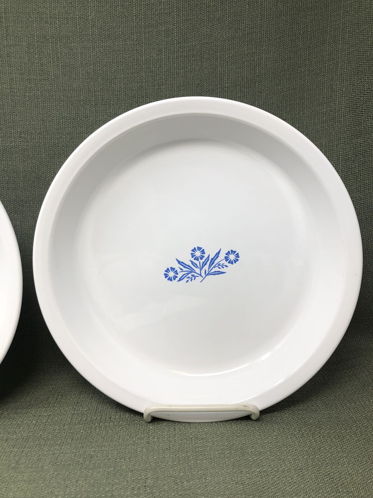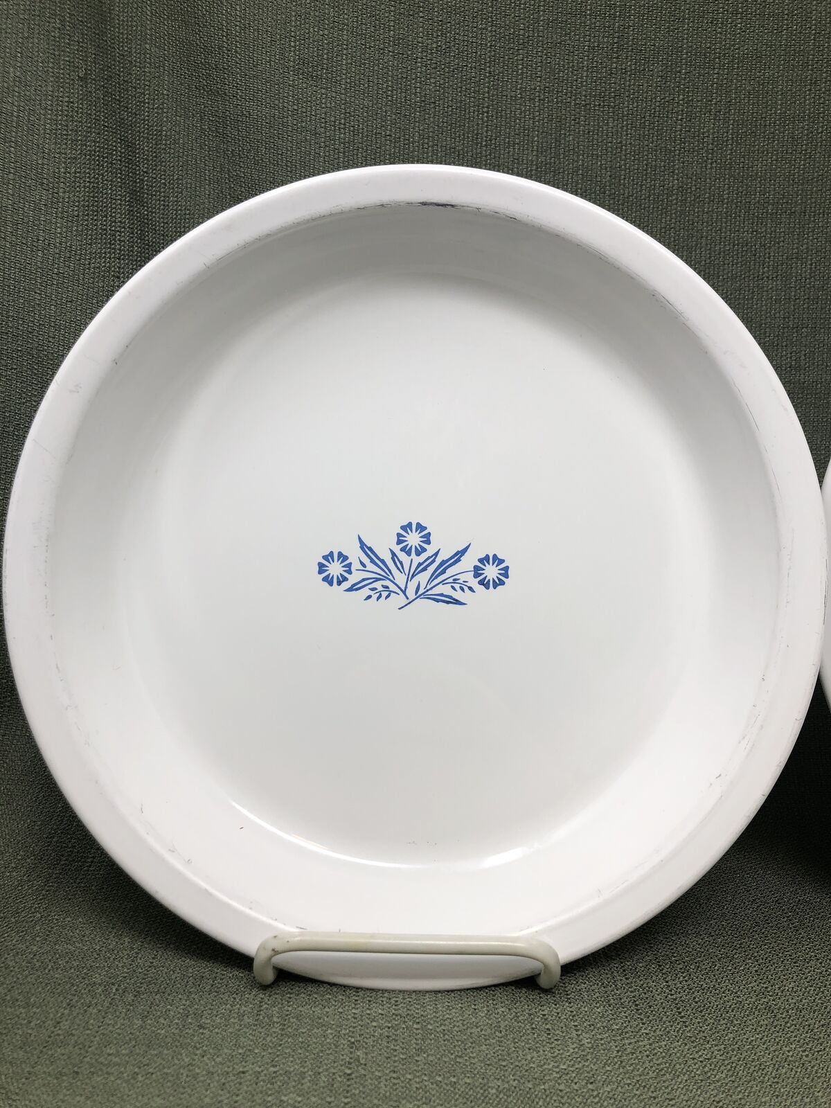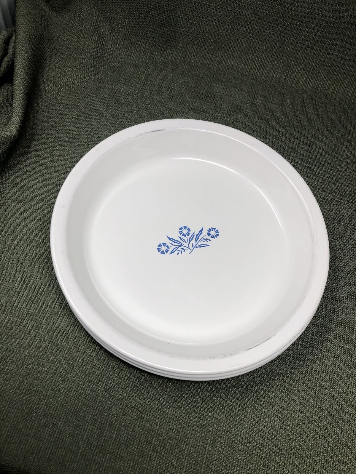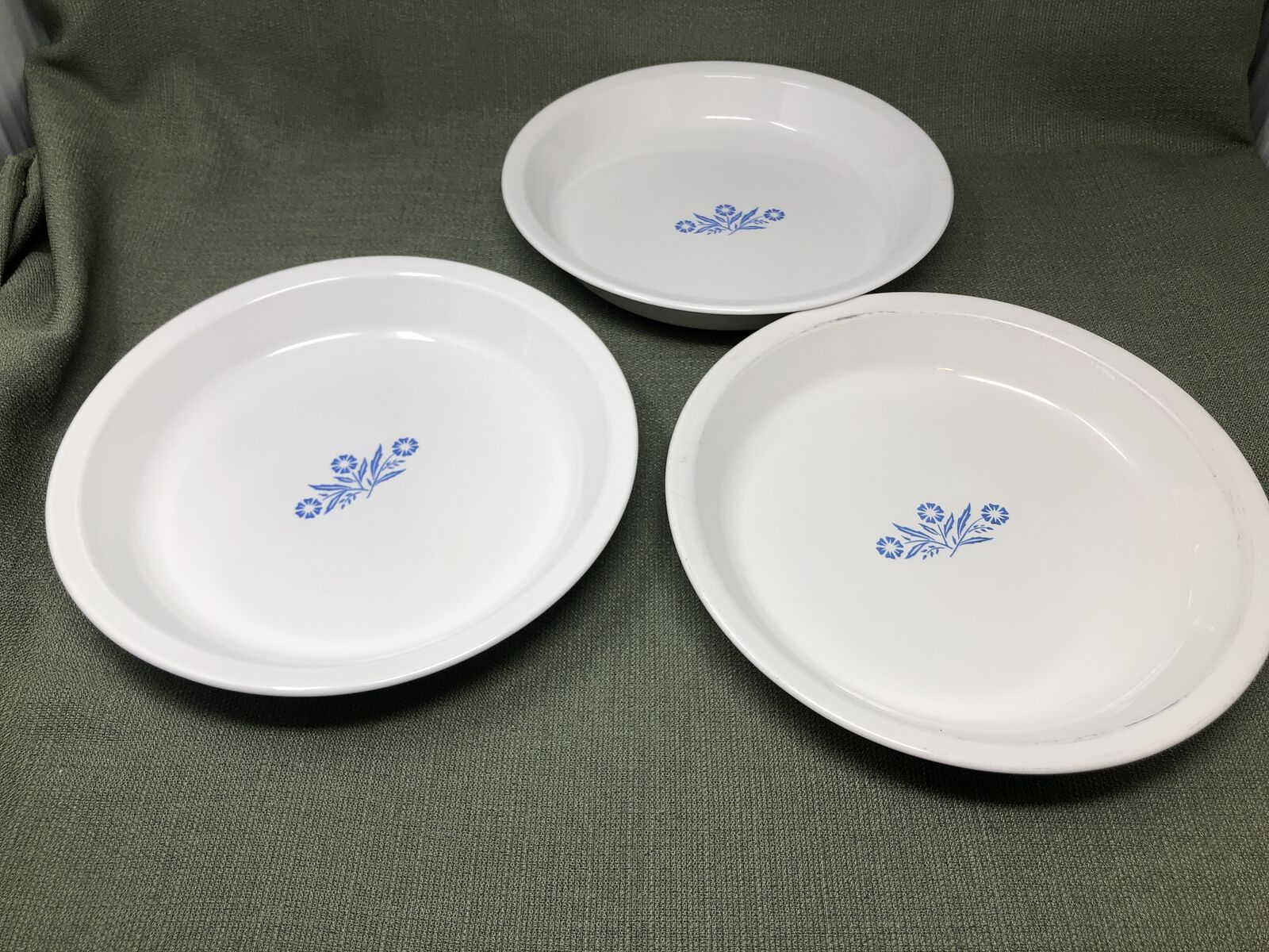 VenmoSet of three CorningWare 9-inch pie plates, perfect for baking pies, quiches, and desserts. Two of the plates are in excellent condition, while one shows light surface scratches from normal use—no cracks or chips. Made from durable CorningWare glass that heats evenly and is oven safe. A great, dependable set for everyday baking or adding to your bakeware collection.