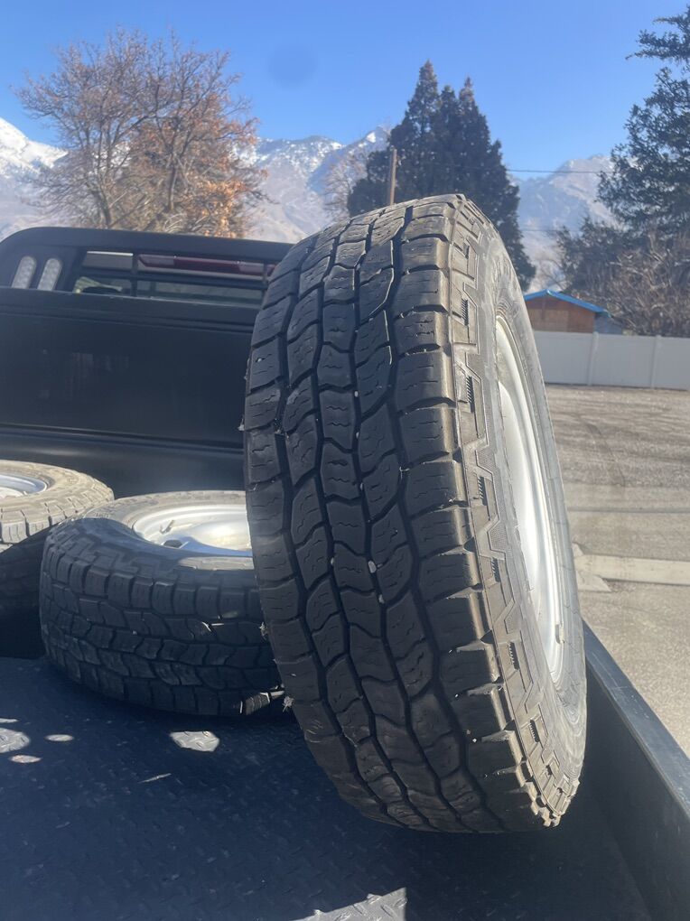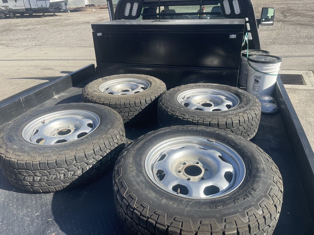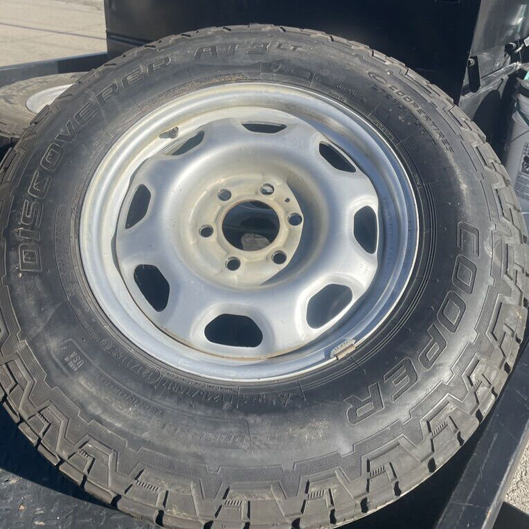 ApplePayFull set of 4 Cooper Discoverer AT3 LT tires mounted on OEM Ford 17” steel wheels.