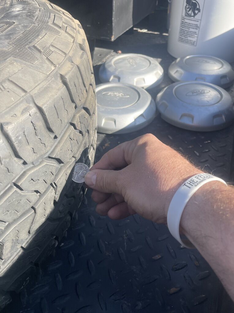 Tires are in excellent condition with lots of tread left. Coin test shown in photos. No patches, no plugs, no cracks, no uneven wear. These were lightly used and taken off a truck that didn’t see hard miles.