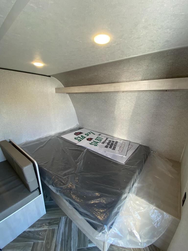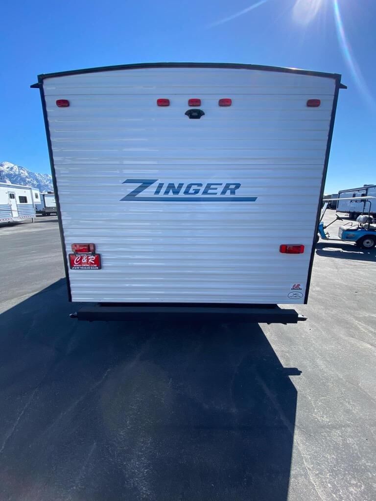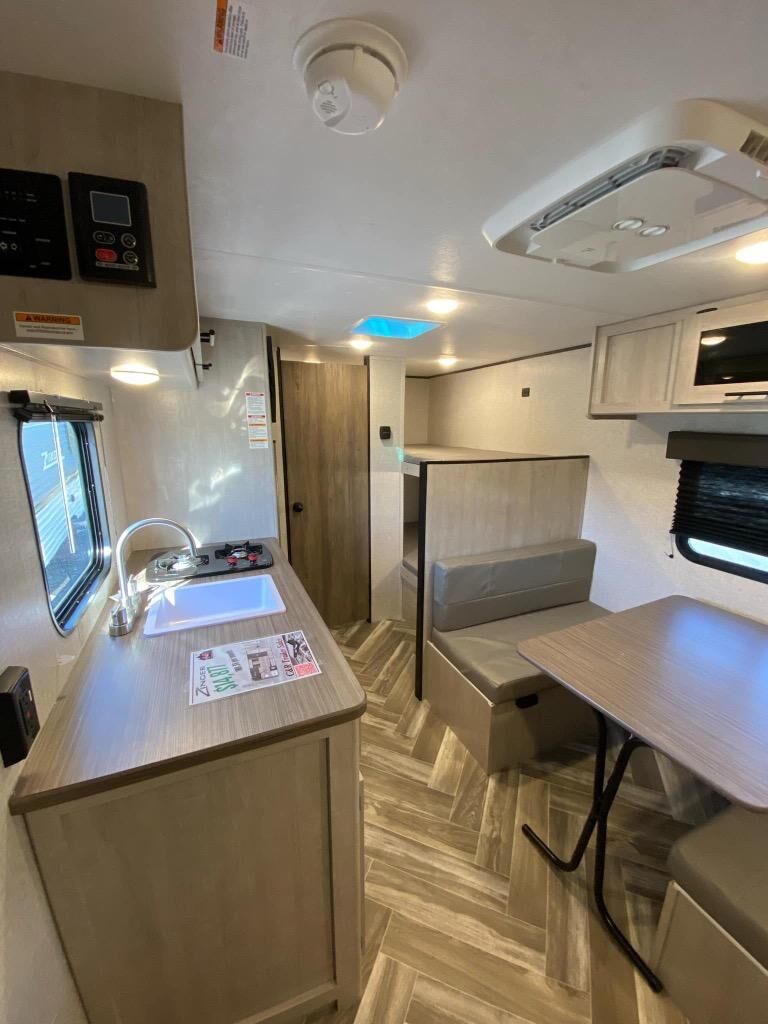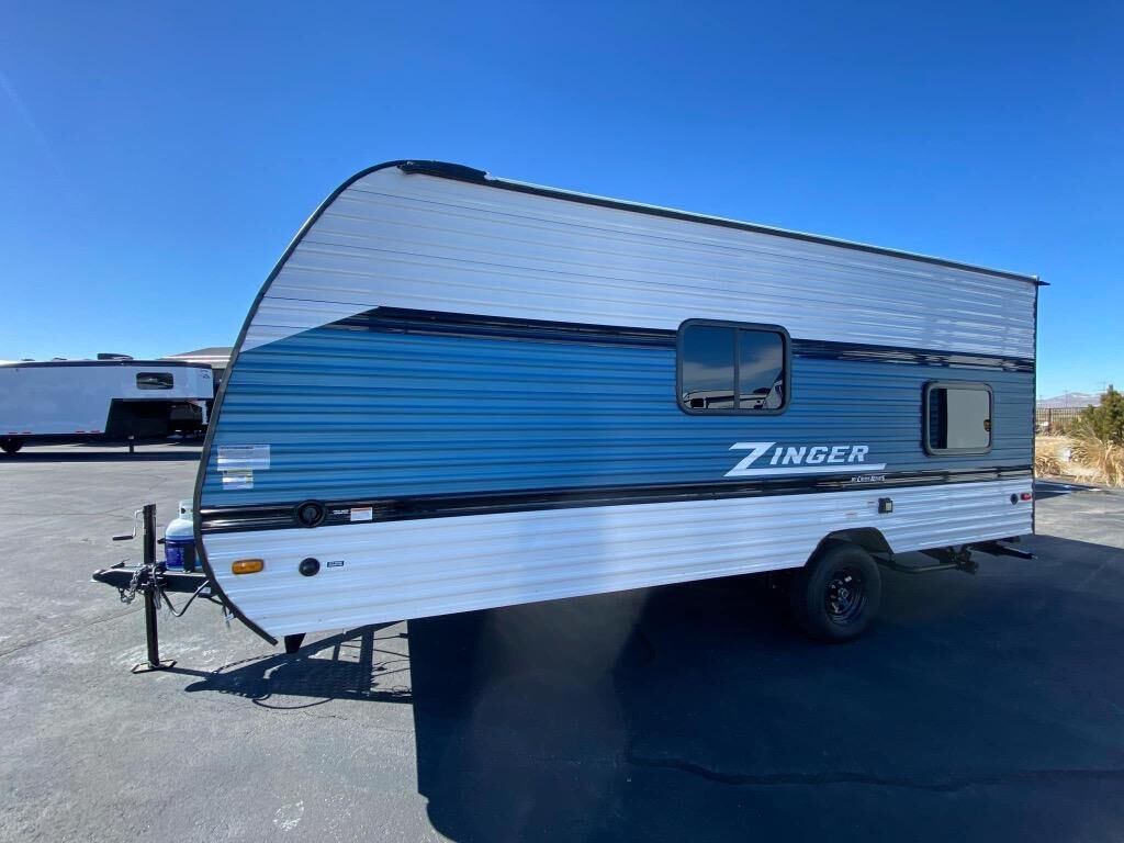 This Zinger Lite travel trailer is perfect for your next family vacation or weekend at the lake with friends. With room for five, this unit gives you the space you need to pack up the kids and the dog and get ready to hit the road! With an RV queen bed and bunk beds, everyone will have a place to sleep. The 38" booth dinette can comfortably hold one to two little ones or an adult guest. Use the** two burner range** to make a home-cooked meal and easily store your leftovers in the 12V refrigerator. Enjoy extra privacy with a rear corner bath that includes a 30" x 36" shower. This unit features multiple overhead compartments, so bring along the board games and other valuables from home.