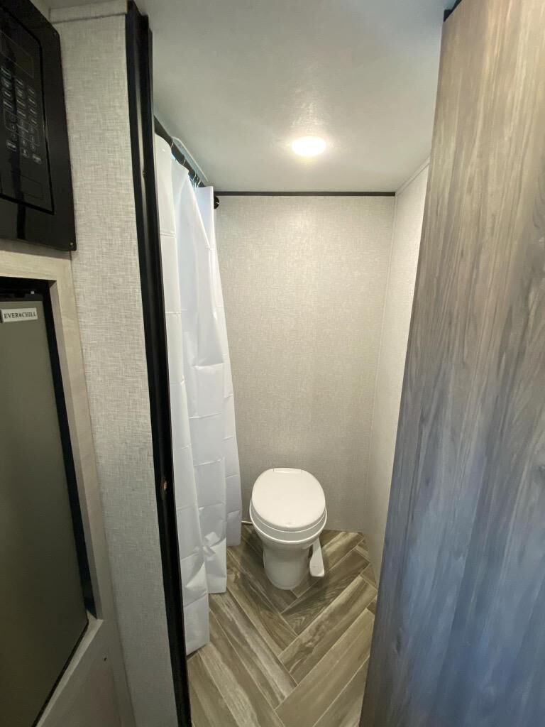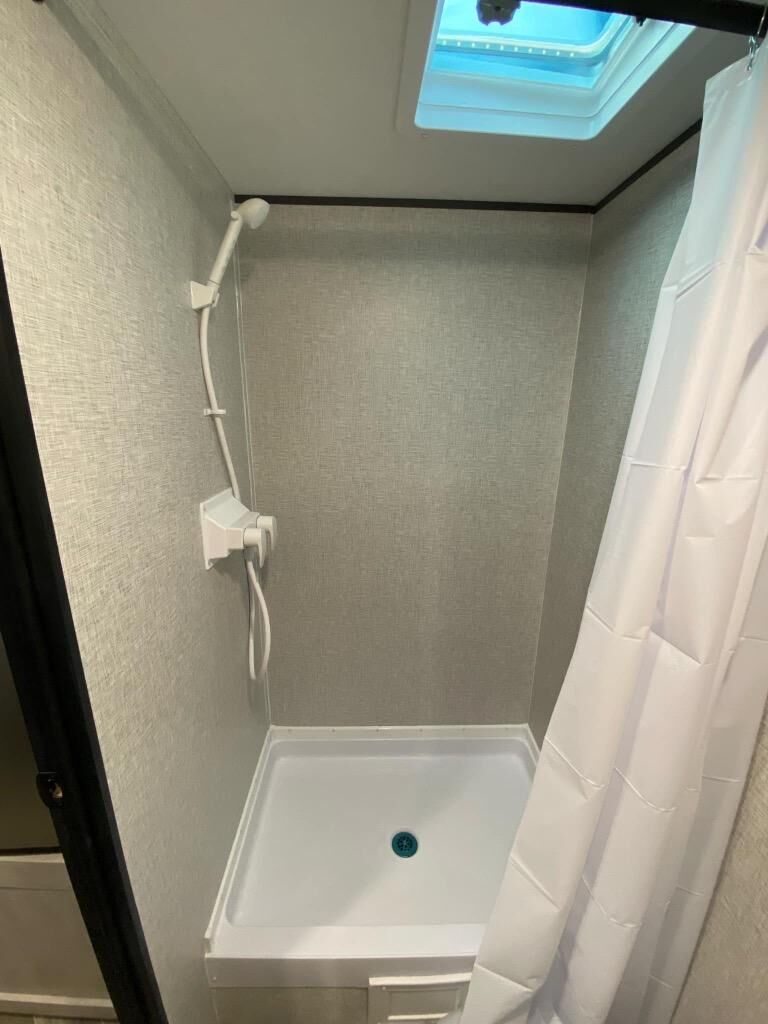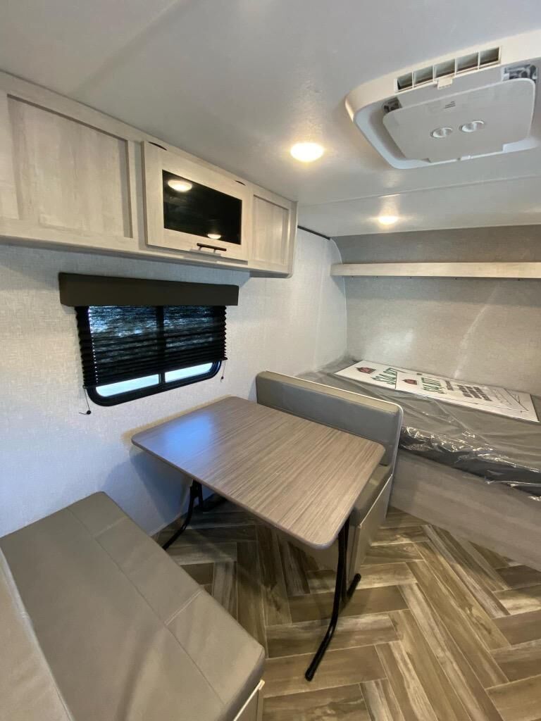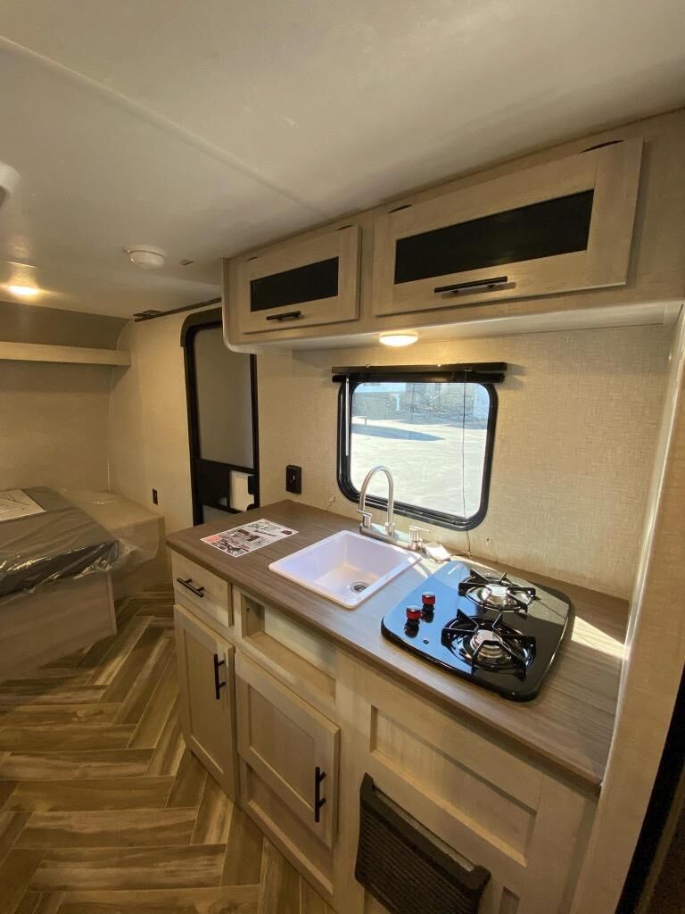 This Zinger Lite travel trailer is perfect for your next family vacation or weekend at the lake with friends. With room for five, this unit gives you the space you need to pack up the kids and the dog and get ready to hit the road! With an RV queen bed and bunk beds, everyone will have a place to sleep. The 38" booth dinette can comfortably hold one to two little ones or an adult guest. Use the** two burner range** to make a home-cooked meal and easily store your leftovers in the 12V refrigerator. Enjoy extra privacy with a rear corner bath that includes a 30" x 36" shower. This unit features multiple overhead compartments, so bring along the board games and other valuables from home.