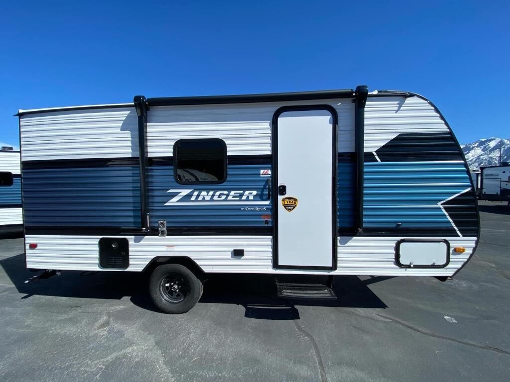 Join the CrossRoads family with a Zinger Lite travel trailer! You'll enjoy an abundance of standard features you would usually find with higher priced travel trailers. Each model features a Super Flex Alpha Roof and front diamond plate for added strength and durability. There is also an electric awning outdoors, along with pass-through storage, rear ladder prep, and a tankless on-demand water heater for added convenience. The interior features pleated shades/mini blinds/fabric window treatments, a 12V refrigerator, comfortable seating and seating spaces, plus plenty of storage for your personal belongings and camp gear!