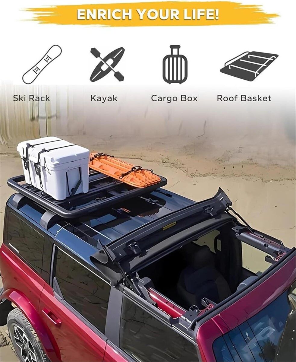 SPECIFIC COMPATIBILITY: The roof rack crossbars fit for 2021 2022 2023 2024 2025 FORD BRONCO 4-DOOR with Hard Top ONLY. 330lbs load capacity: Our half roof rack is designed with a strong construction that can support up to 330lbs, ensuring the safe and secure transport of heavy loads. This provides you with ample storage space for their outdoor gear and equipment. DURABLE CONSTRUCTION: Our roof rack is crafted from high-quality materials to ensure long-lasting durability and dependable performance. EASY INSTALLATION: Save time and effort with our user-friendly design. Spend less time fumbling with installation and more time enjoying your journey with our cargo racks. VERSATILE UTILITY: Designed for various outdoor activities, our half roof rack is an essential accessory for your adventures. Whether you're heading out for a camping trip, embarking on a cross-country road trip, or simply need additional storage space, our half roof rack has got you covered.