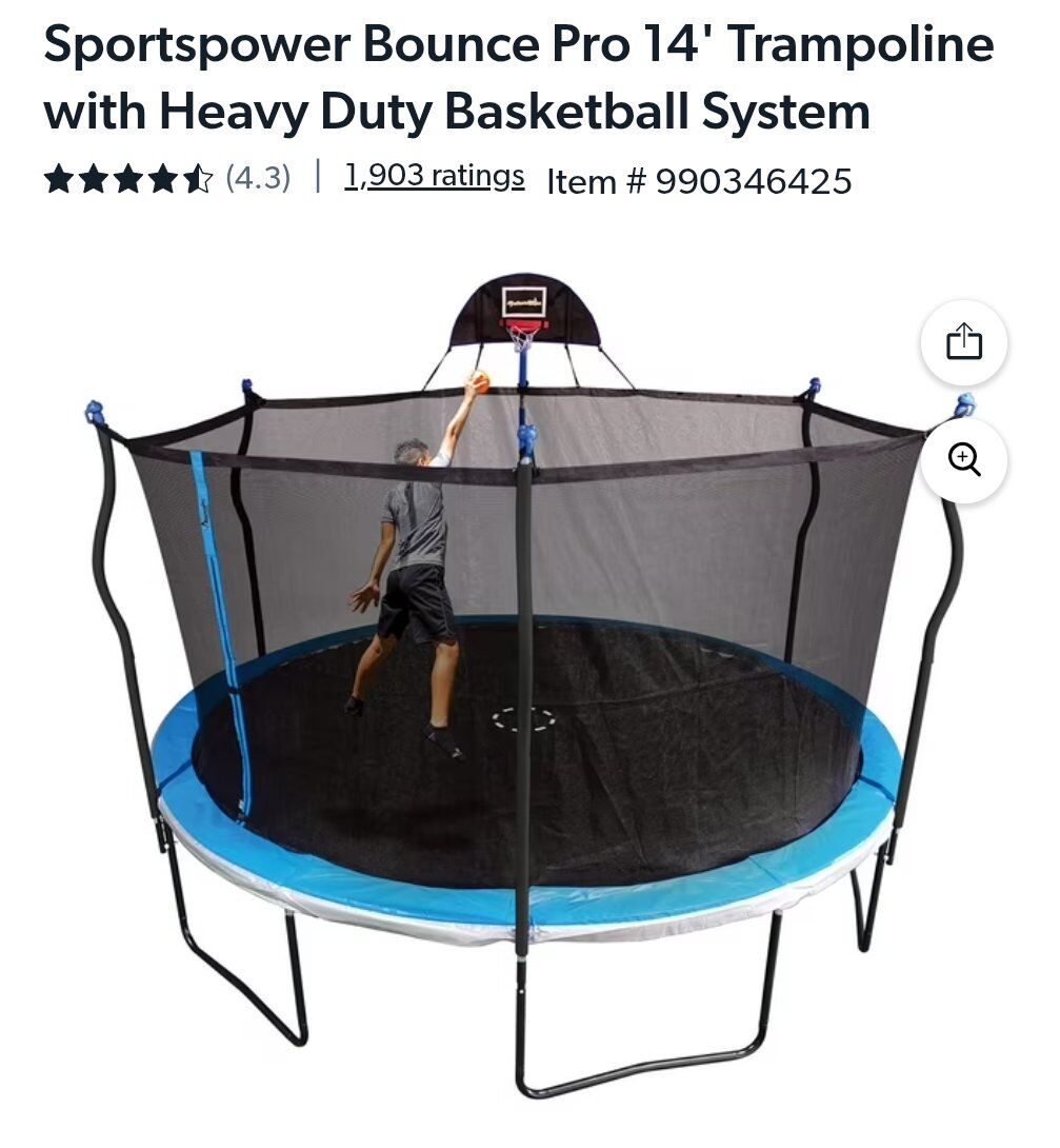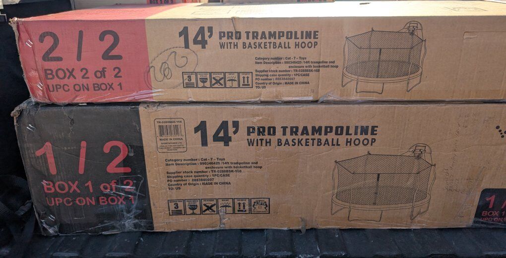 VenmoBrand new in the box BouncePro 14ft Round Trampoline with Safety Enclosure and Heavy Duty Basketball hoop. Asking $230. Text if interested 801-903-8337