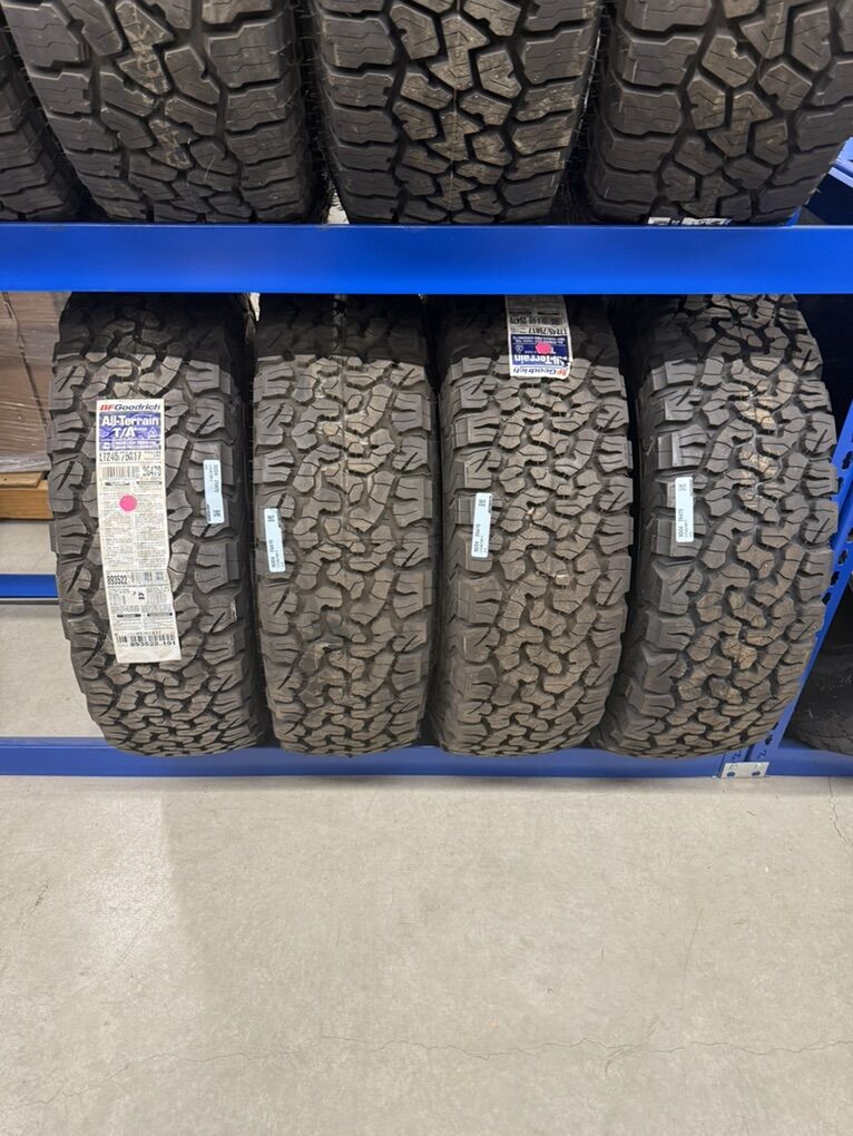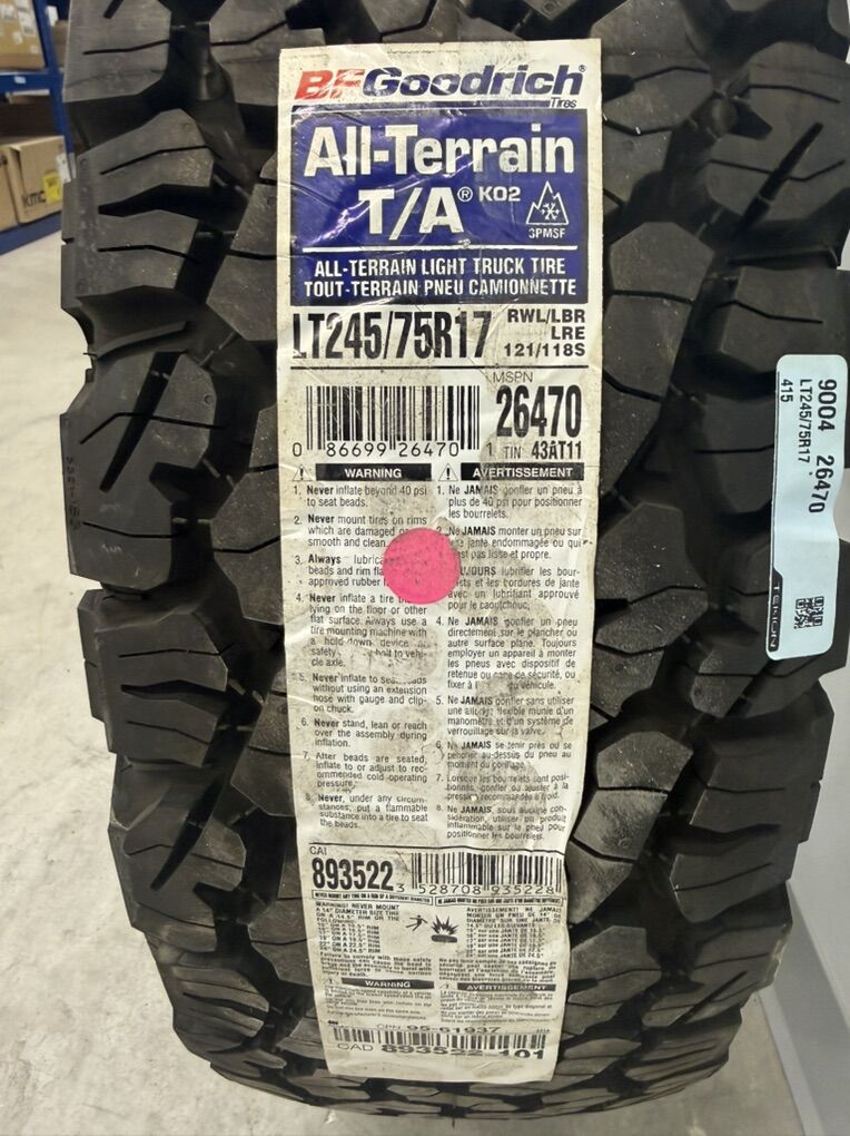 Brand new set of 4 BFGoodrich All-Terrain T/A KO2 tires. Size: LT245/75R17 Load Range E (10-ply rated) Load Index: 121/118S 3PMSF rated for severe snow conditions
