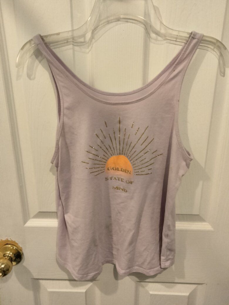 graphic tank top with a metallic sunburst design and the text "GOLDEN STATE OF MIND".