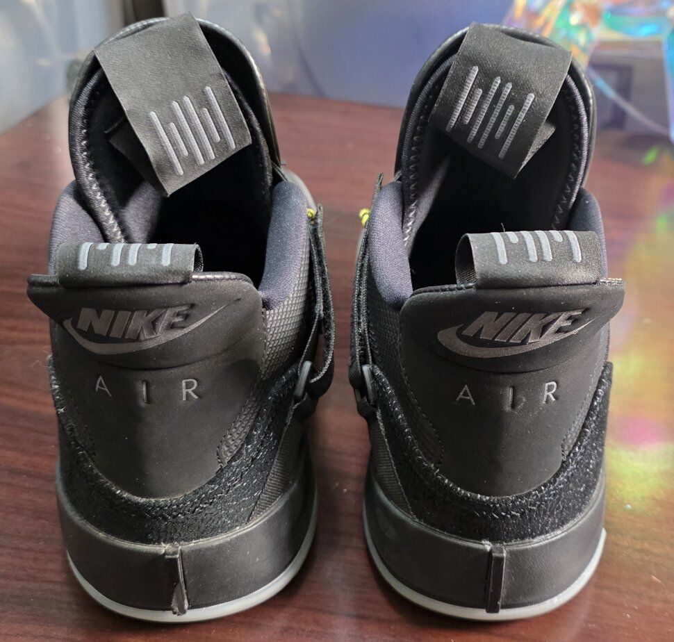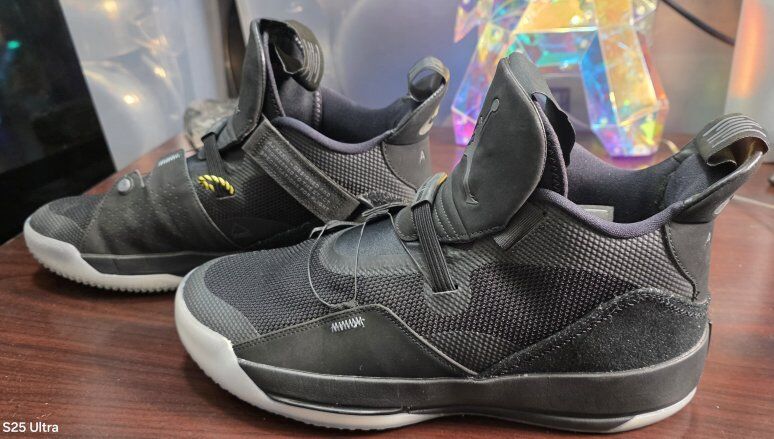Pre-Pre-Owned Nike Air Jordan XXXIII (33) Men's Basketball Shoes Black/Dark Grey-White, Size 11 AQ8830-002. In perfect Conditions, NO BOX. This Blackout Air Jordan XXXIII is the first pair of Jordan sneakers that do not have laces. Instead, this sneaker uses a pull system called Fast Fit to tighten them. They also have a different version of FlightSpeed technology. The Air Jordan 33 'Blackout' sneakers have a black design with a utility style. The upper part of the shoe looks futuristic and has clear plastic, suede, as well as mesh overlays. There also features some other details, like a yellow "Eject" cord, and a touch of elephant print on this shoe’s heel.