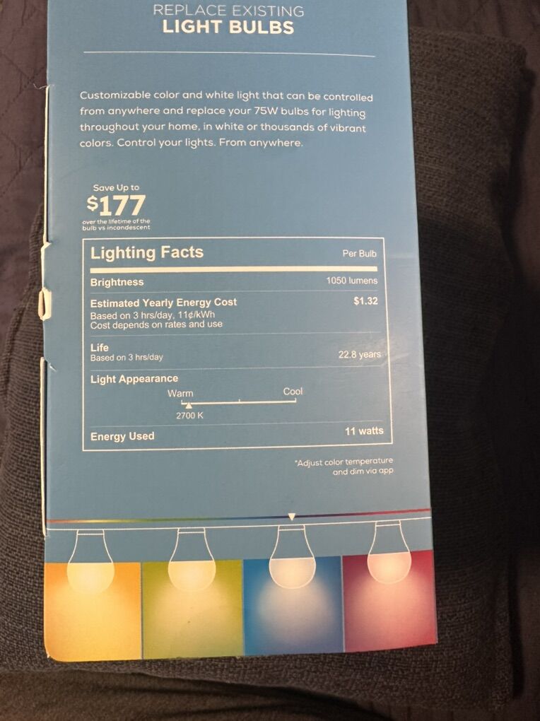 Venmo2 boxes of Merkury Innovations A21 Smart Wifi LED Bulbs Color+White 2 Pack. Total of 4 bulbs. Brand new. Boxes not opened. $11 per box. For 2 boxes $20