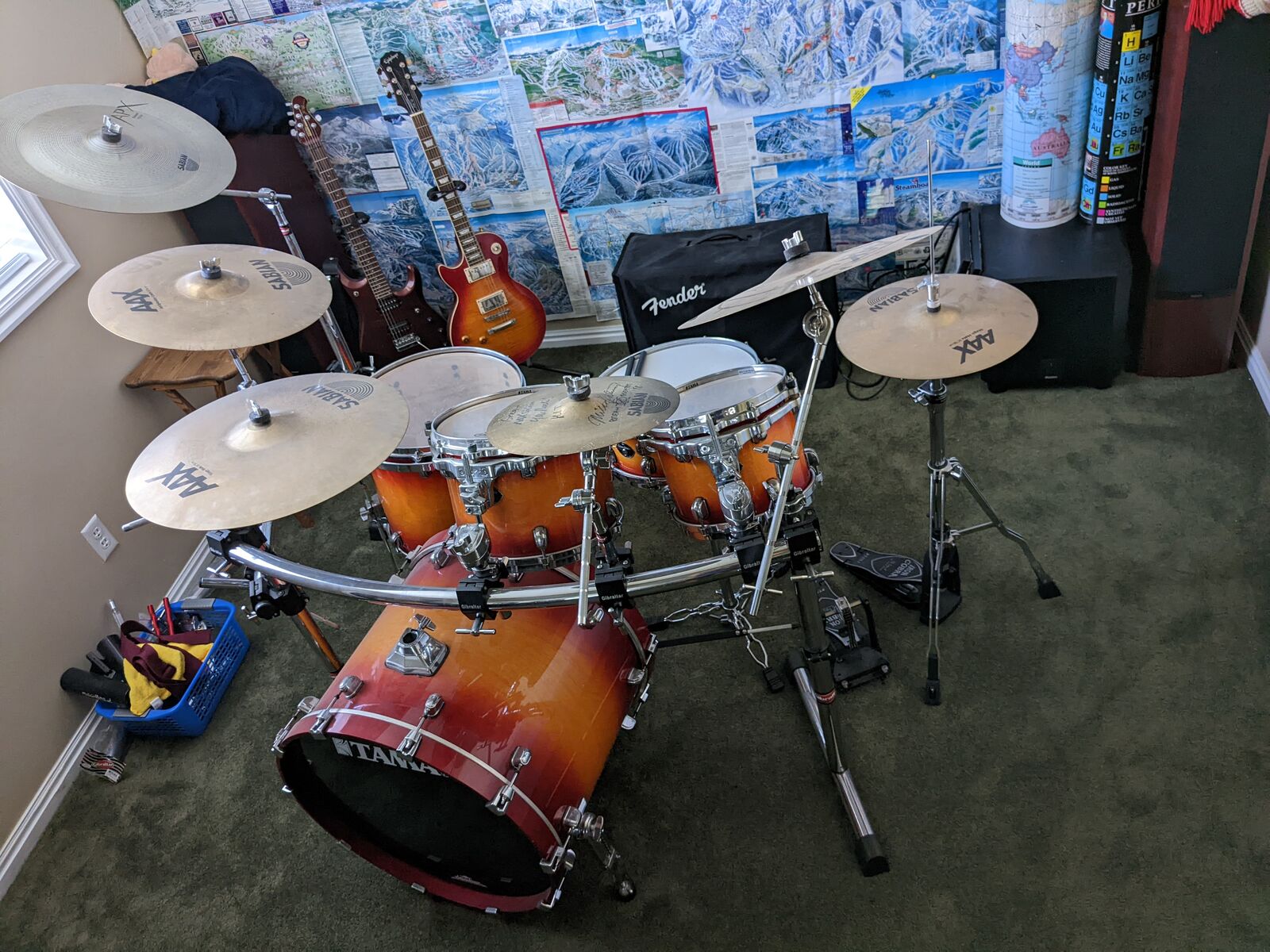 2008 Tama Starclassic Birch Antique Sunburst (ATS) with Gibralter rack and throne. One Owner. Has never left my basment since buying new. Very little use over its lifespan. Cymbals will clean up nicely with a little elbow grease. Heads are relatively new.