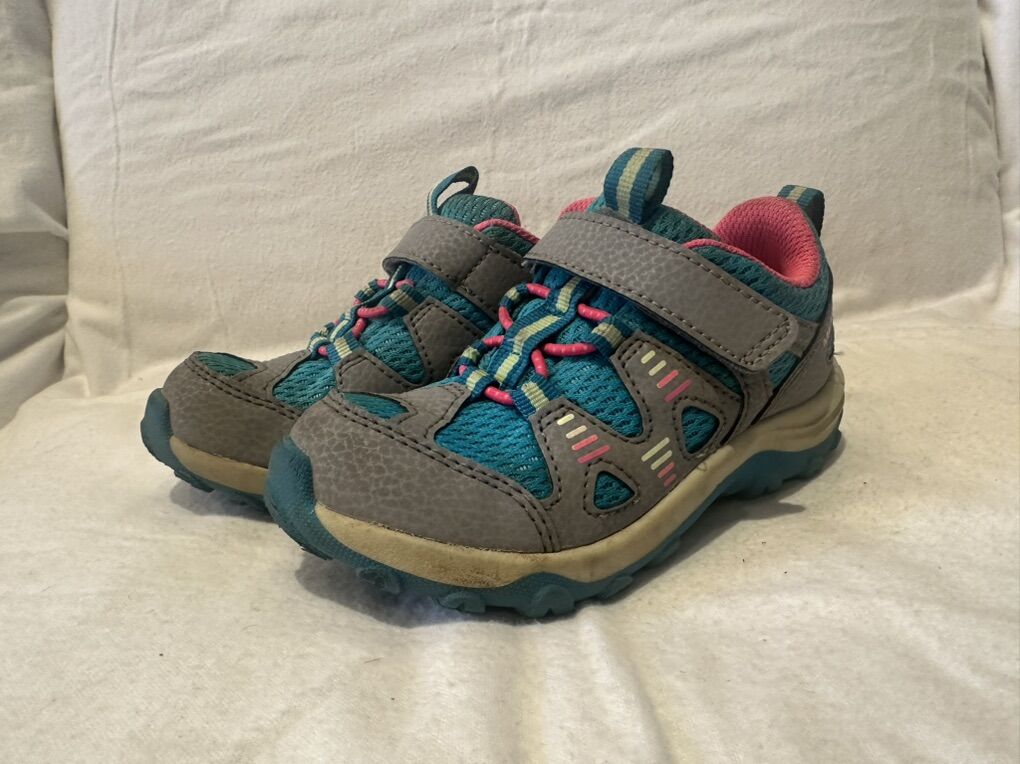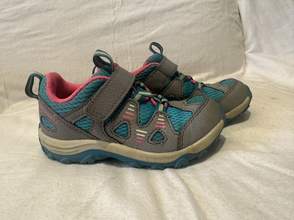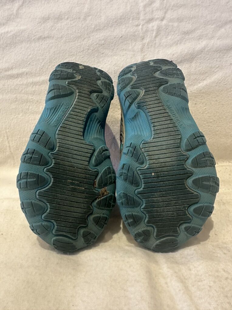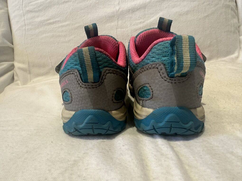 Merrell toddler size 10 beach blue with pink trim, elastic laces and a Velcro strap at the top hiking shoes. These are in excellent condition, see photos for details. I take cash or Venmo, but cash is preferred. Text is best. 801-201-4446. Check out my other ads for additional sizes and styles.