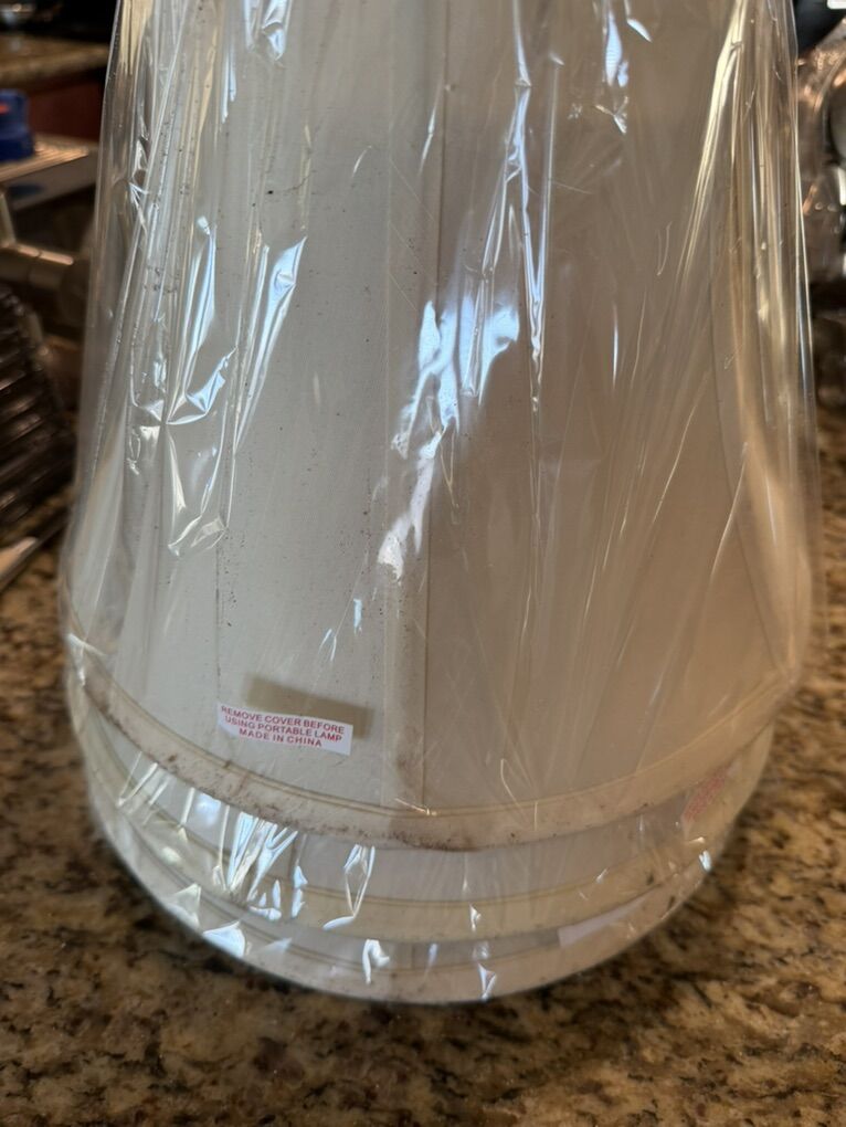 The lamp shades show dirt and debris jnside the protective plastic film but it’s just residue from the shredded cardboard the manufacturer placed inside the box to protect the lamps. The dirt/debris are easily wiped off.