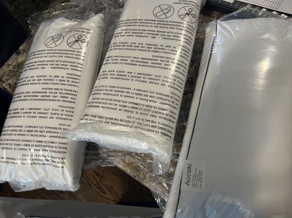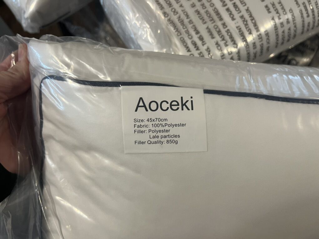 ZelleThe Aoceki pillow measuring 45x70cm is a hotel quality sleeping pillow with a shell fabric made of 100% polyester and a filler also made of polyester fiber particles. The filler quality/weight is specified as 850g.