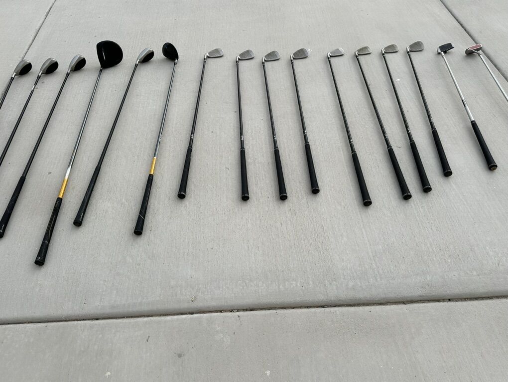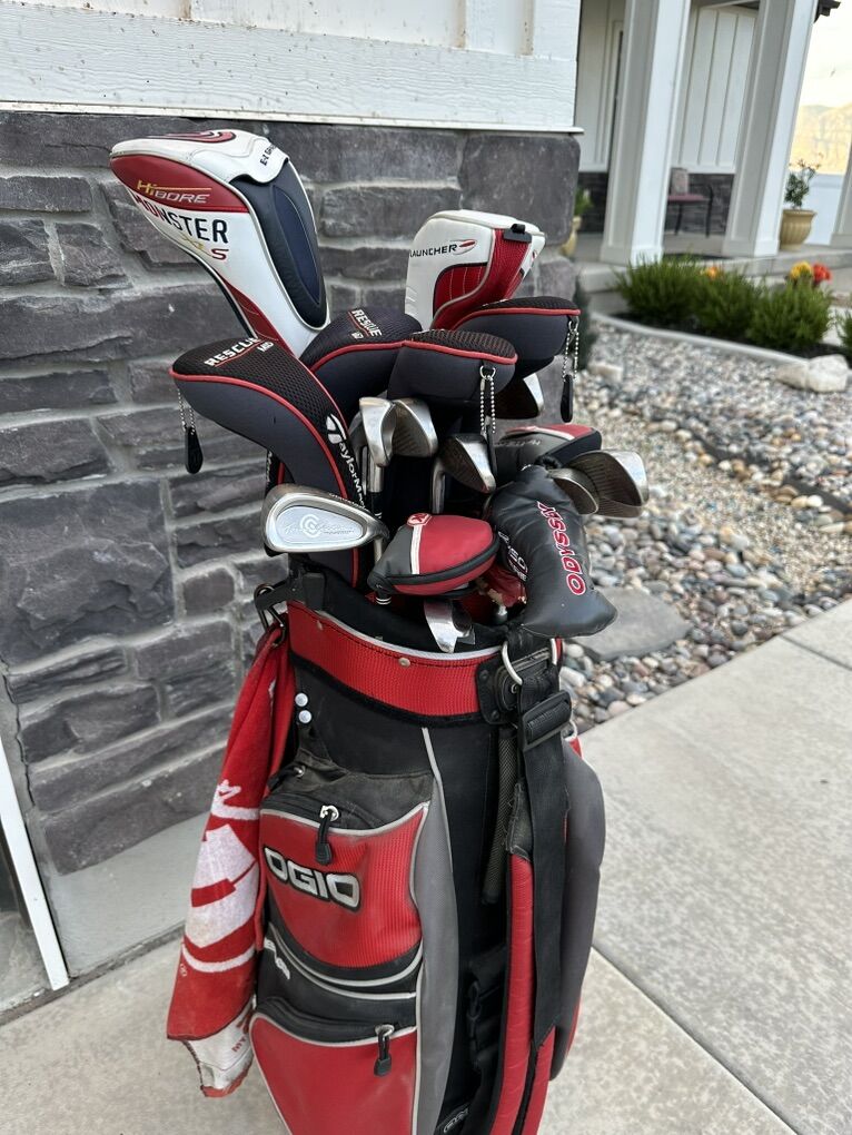 Complete set of golf clubs. Includes Cleveland Hi-Bore Monster XLS10.5 Draw Driver, Cleveland Launcher 5-Wood, Taylor Made Mid Rescue Clubs 2 16 degree, 3 19 degree, 4 22 degree, 5 25 degree, Cleveland Tour Action Irons 3-9, PW, Odyssey 37degree chipper, Odyssey XG #7 White Hot Putter, Ogio 8 pocket golf bag. Slightly used. Well maintained.