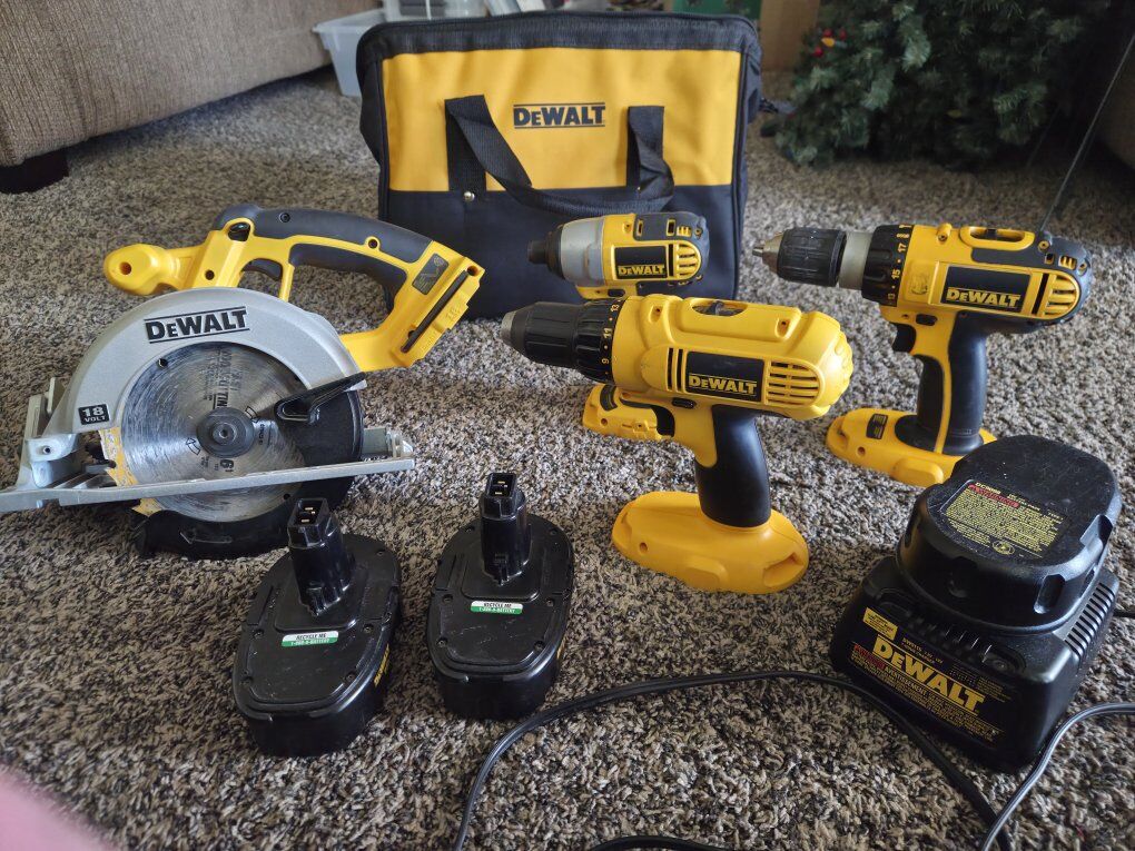 1 drill.1 Hammer drill. 1 Impact .1 Saw .3 Batteries .Charger and Bag .They are Basically All New As pitchers Show.
