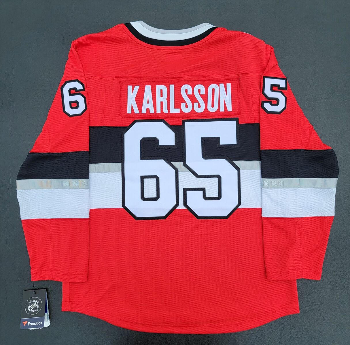 ZelleNew w/Tags 2017 Ottawa Senators 100th Anniversary Erik Karlsson #65 Hockey Jersey. Fanatics Breakaway, Size Large. Brand new, never worn. 100th Anniversary patch, plus each year the Sens won the Stanley Cup stamped into the sleeves, Super Cool Jersey! ~ $110 shipped in