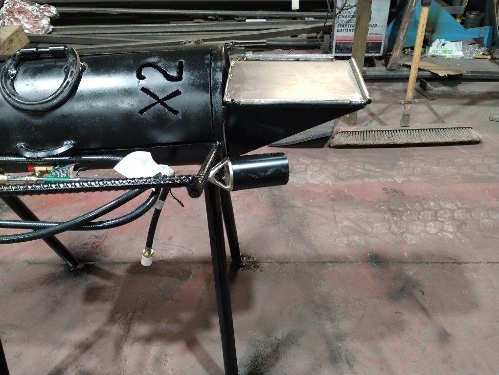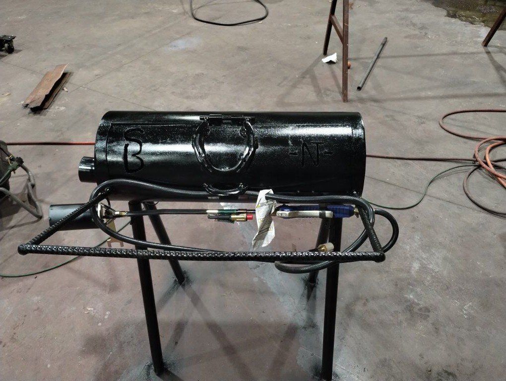 These stoves are Perfect to heat your irons on. Built with 8" pipe they are heavy duty but still light enough to easily move, the removable legs fit inside for easy compact storage and setup. Horseshoe hing and handle for that rustic look. Only $275 this includes the burner with ignitor on it.