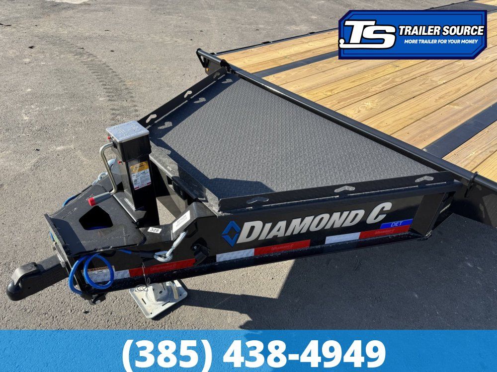 KEY STANDARD FEATURES Wheels and Tires Specifications The DET208 (the 18,000 lb GVWR package) comes standard with high-capacity running gear to handle industrial loads: Tires: ST215/75R17.5 radial tires. Load Range: 18-ply (standard on the 208 and 210 models for 2026). Wheels: 8-hole heavy-duty steel wheels, typically in a black powder-coat finish. Spare Mount: Includes a retractable cable winch spare tire mount located under the frame to maximize deck space. Engineered I-Beam Frame This is Diamond C’s "Signature" feature. The frame is constructed using a high-strength, low-alloy steel that is laser-cut and robotically welded. This allows for a taller, stronger beam in high-stress areas while shedding unnecessary weight, giving you a superior strength-to-weight ratio. Electric/Hydraulic Powered Tilt with Bluetooth The full-bed tilt is driven by an electric/hydraulic system with a massive power cylinder. For 2026, the Bluetooth Wireless Remote is standard, allowing you to operate the tilt from inside your equipment or a safe distance away. HD V-Tongue Storage Lid The area between the tongue beams is utilized as a massive storage box. The lid is made of 1/8" diamond plate and is reinforced so it can be walked on or used as an extension of the deck, providing a secure place for chains, straps, and the hydraulic pump. Slipper Roller Suspension To ensure a smoother ride and less maintenance, the trailer uses a 6-leaf slipper roller spring suspension. The "roller" aspect significantly reduces the friction and wear typically found in traditional leaf spring systems, extending the life of your axles and tires.