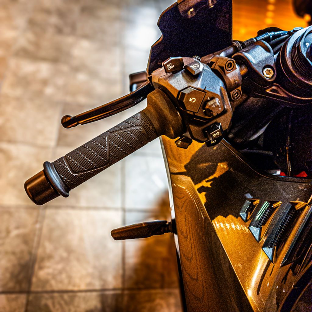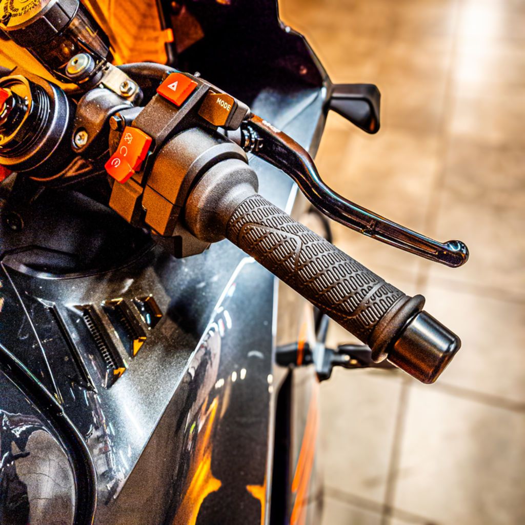 The KTM 990 RC R's ergonomics are standout. To ensure that the rider is integrated in a way to grapple the Supersport DNA of the bike without compromising day-to-day comfort and practicality, KTM has fashioned a tank shape with 6 contact points. The form of the product will suit a wide range of heights and permits the rider to 'glide' around the motorcycle while still being able to exert control through legs, knees and arms. The KTM 990 RC R has aluminum clip-on handlebars, adjustable levers and adjustable footpegs: the standard 'street' setting can be moved 25 mm back and 17 mm higher for a more racing 'track' poise and more influence for full lean angles.