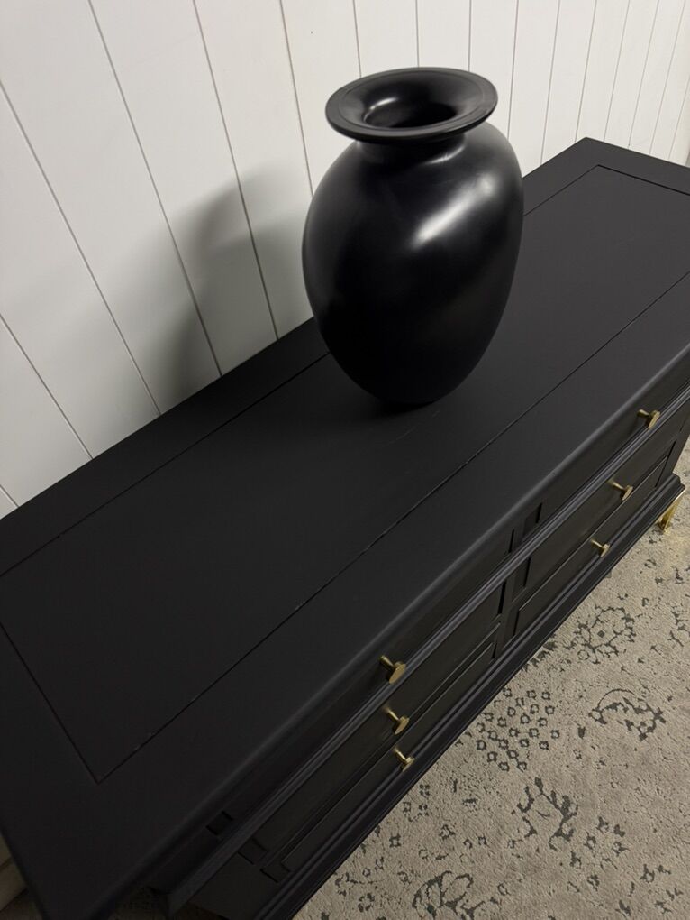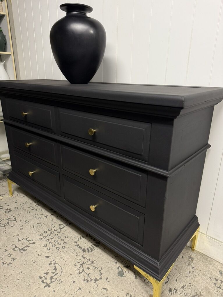Beautiful Broyhill dresser refinished in Matte black with gold pulls and gold metal legs added for additional height! This dresser has 6 fully functional drawers! Solid wood minimal dents across surface