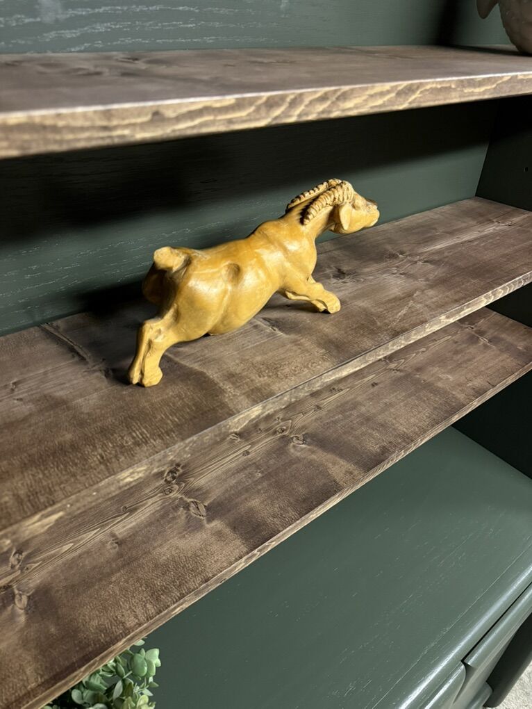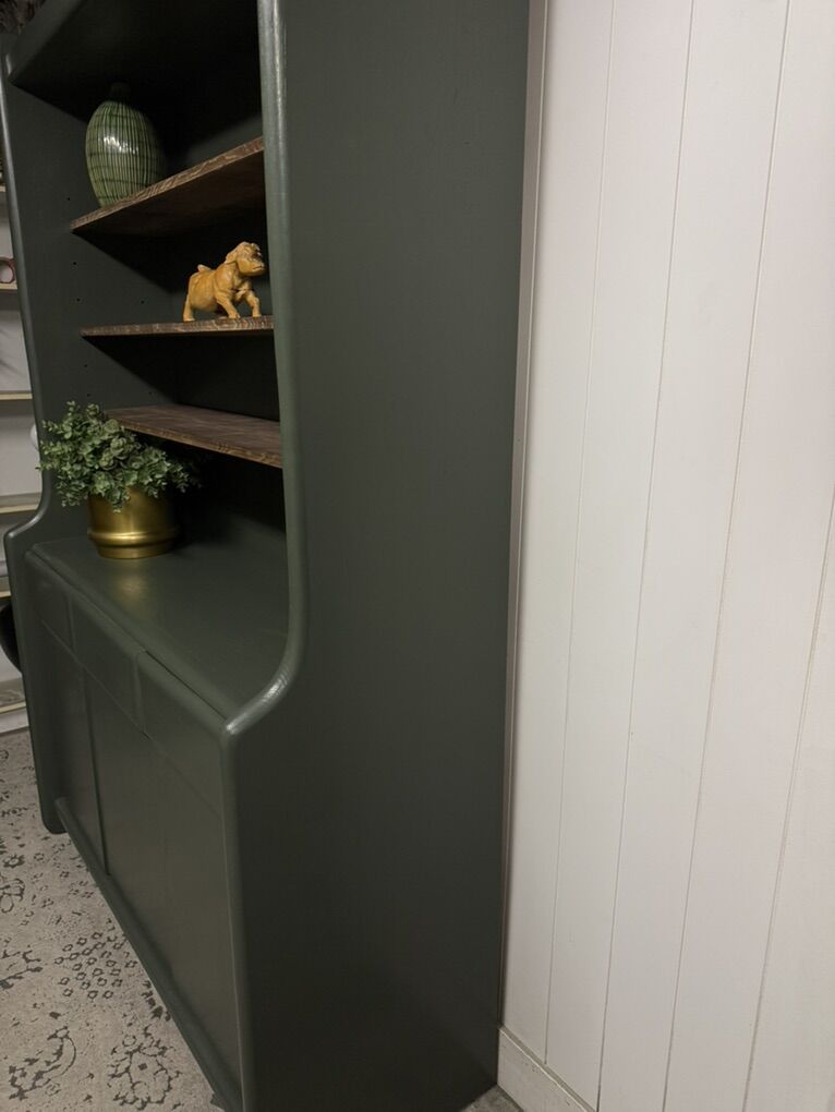 VenmoStunning solid wood hutch refinished in a dark green with hickory stained wood shelfs! The 3 shelfs are fully adjustable to your desire! The bottom has two drawers that run on original metal tracks!(Faux center drawer) has two side cupboards with a shelf inside, perfect for all your storage needs! (Faux center cupboard as well)! The cupboard are push to open for that hardware less clean finish! This piece is SOLID wood and extremely heavy please plan accordingly when picking up!